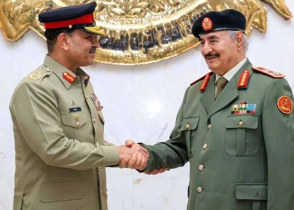 پاک فوج کے شعبہ تعلقات عامہ (آئی ایس پی آر) کے مطابق فیلڈ مارشل سید عاصم منیر، نشانِ امتیاز (ملٹری) اور ہلالِ جرأت، چیف آف آرمی اسٹاف اور چیف آف ڈیفنس اسٹاف ان دنوں سرکاری دورے پر لیبیا میں موجود ہیں جہاں انہوں نے لیبیائی عرب مسلح افواج کے کمانڈر ان چیف فیلڈ مارشل خلیفہ بلقاسم حفتر سے ملاقات کی ہے۔