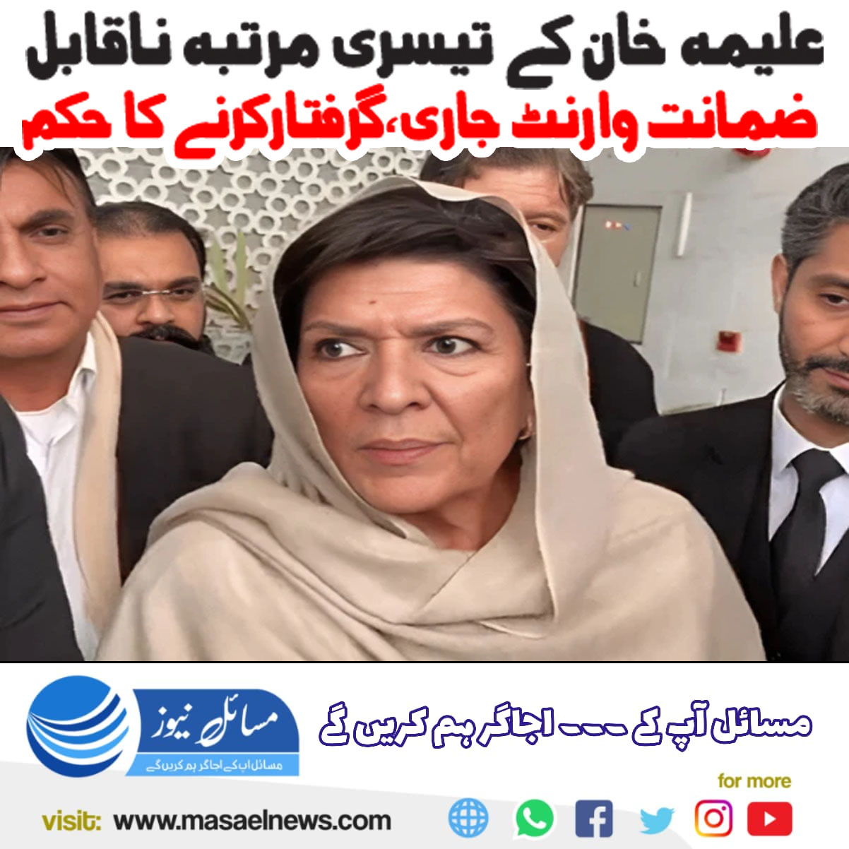 راولپنڈی (مسائل نیوز)انسداد دہشت گردی عدالت راولپنڈی نے علیمہ خان کے تیسری مرتبہ ناقابل ضمانت وارنٹ گرفتاری جاری کرتے ہوئے انہیں گرفتار کرکے پیش کرنے کا حکم دے دیا۔
