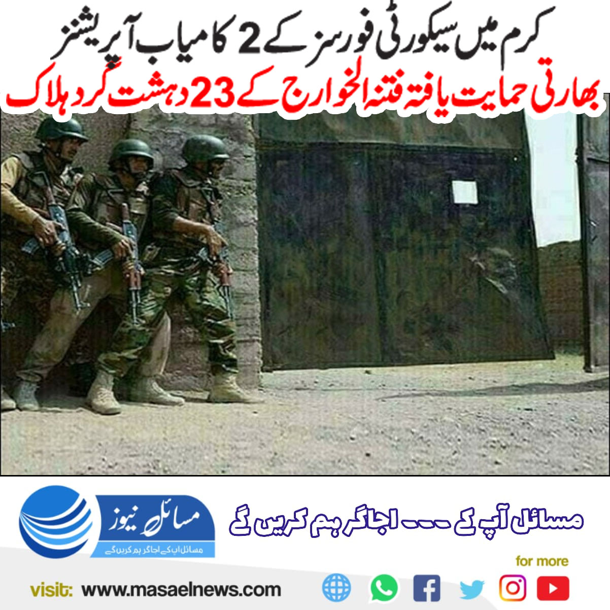 کرم (مسائل نیوز)کرم میں سکیورٹی فورسز کے 2 کامیاب آپریشنز میں بھارتی حمایت یافتہ فتنۃ الخوارج کے 23 دہشت گرد ہلاک ہو گئے۔