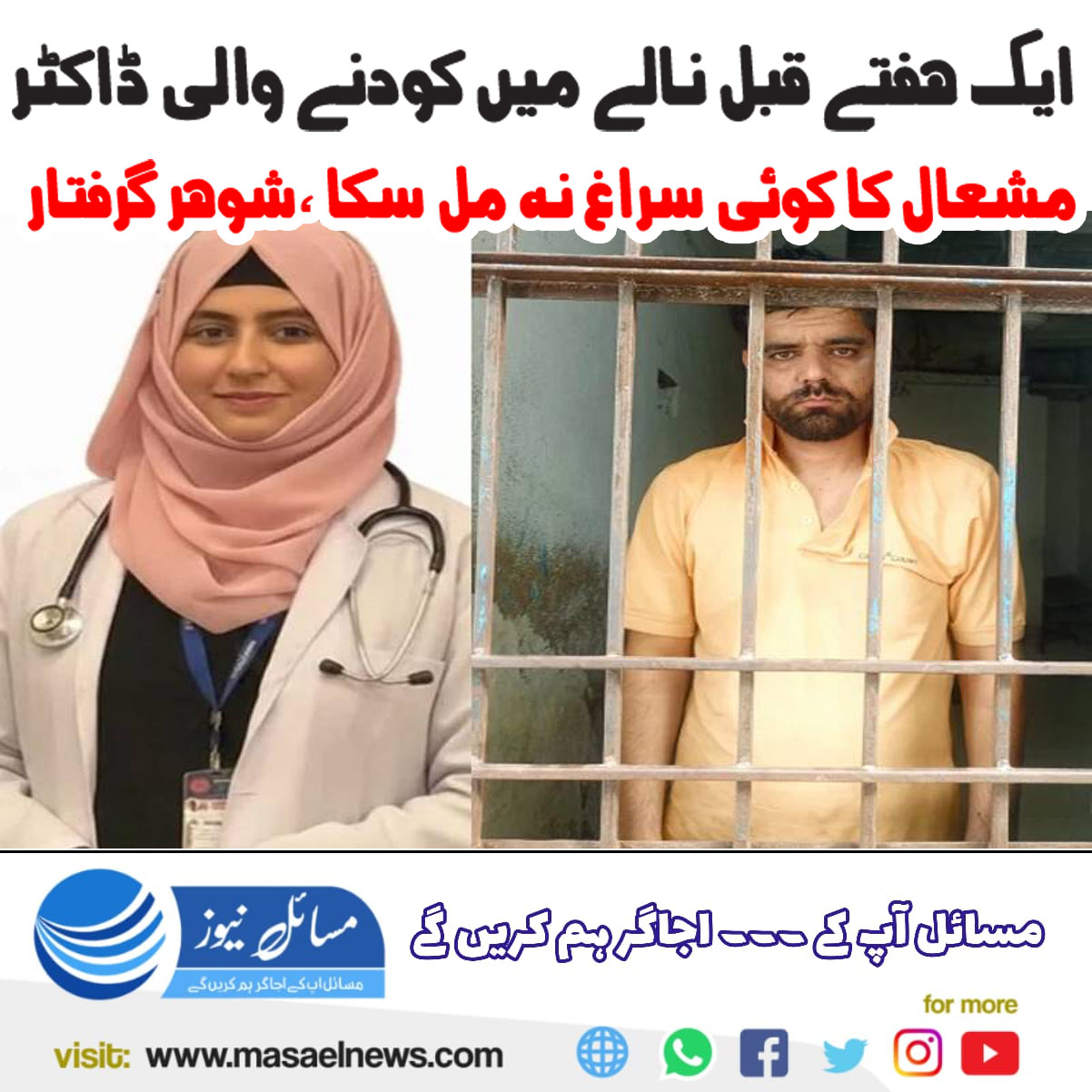 ایک ہفتے قبل نالے میں کودنے والی ڈاکٹر مشعال کا کوئی سراغ نہ مل سکا، شوہر گرفتار