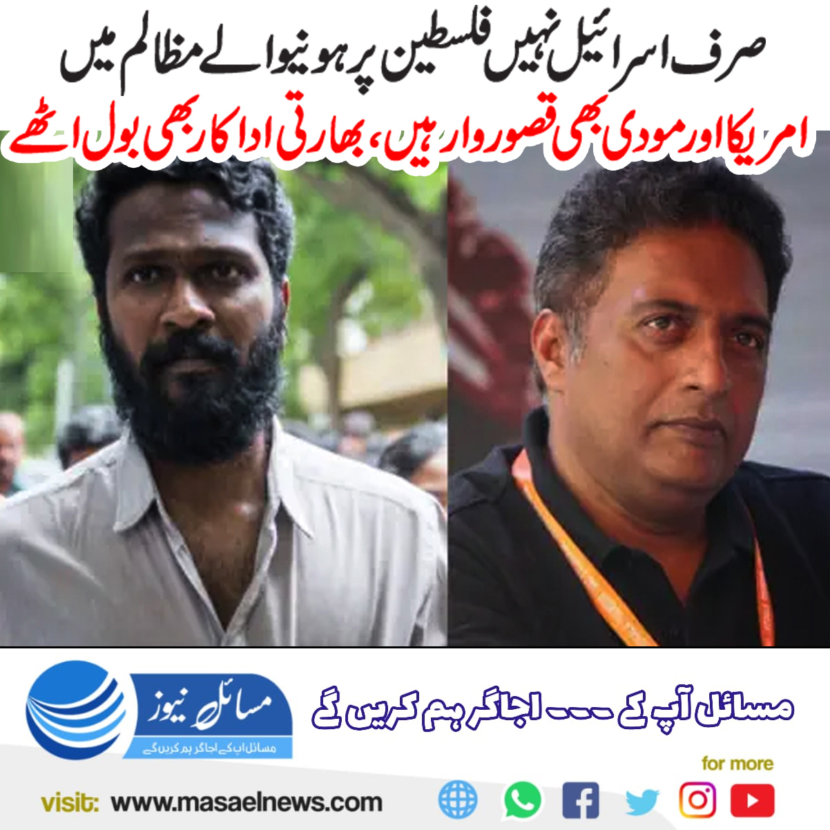 پراکاش راج نے وزیر اعظم نریندر مودی اور امریکا کو تنقید کا نشانہ بناتے ہوئے کہا: ’آج فلسطین میں جو ناانصافی ہو رہی ہے، اس کی ذمہ داری صرف اسرائیل پر نہیں، امریکا بھی برابر کا ذمہ دار ہے اور مودی کی خاموشی بھی اتنی ہی ذمہ دار ہے۔‘