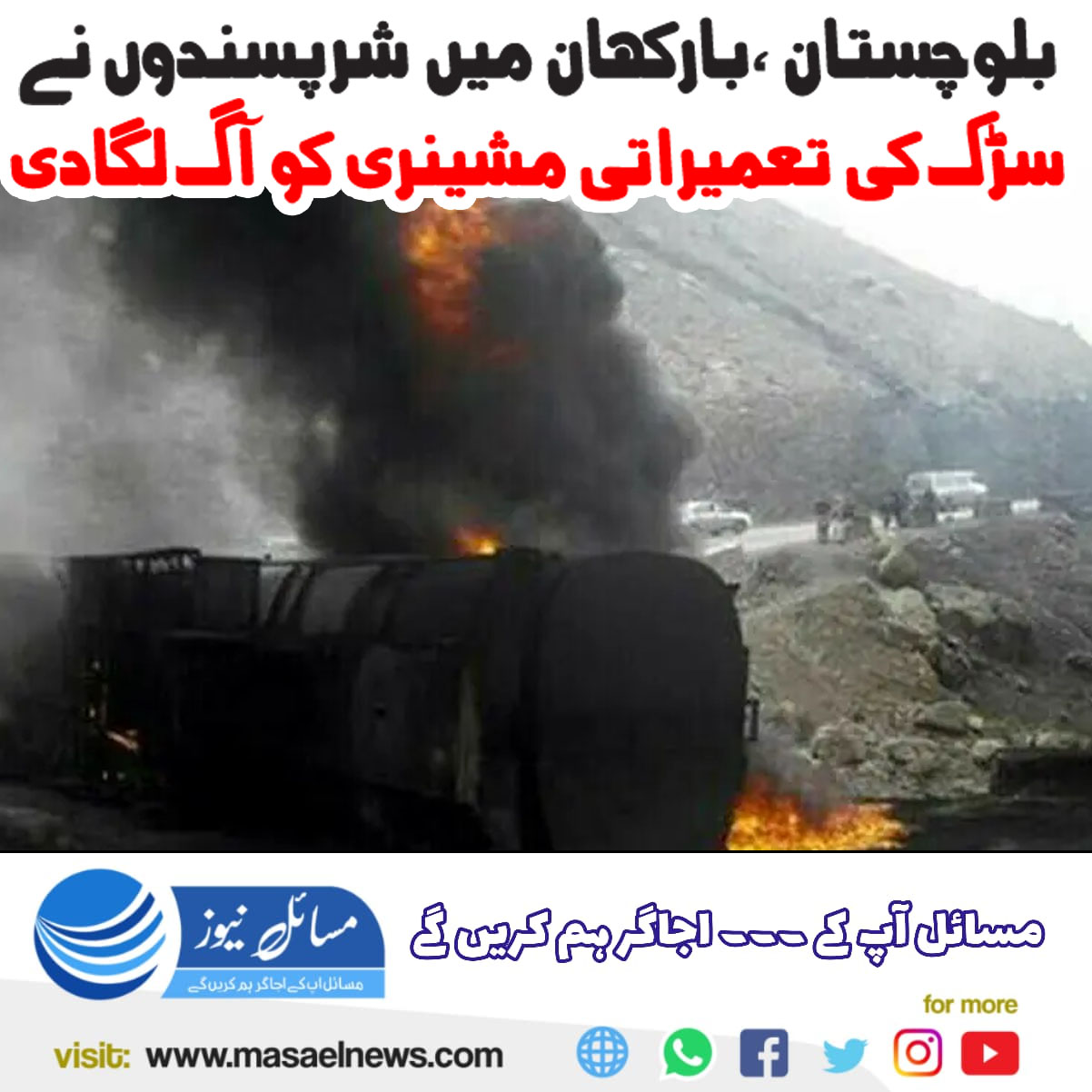 بارکھان (مسائل نیوز)بلوچستان کے ضلع بارکھان میں نامعلوم مسلح افراد نےسڑک کی تعمیر کے لیے استعمال ہونے والی مشینری اور جنریٹر کو آگ لگا دی۔