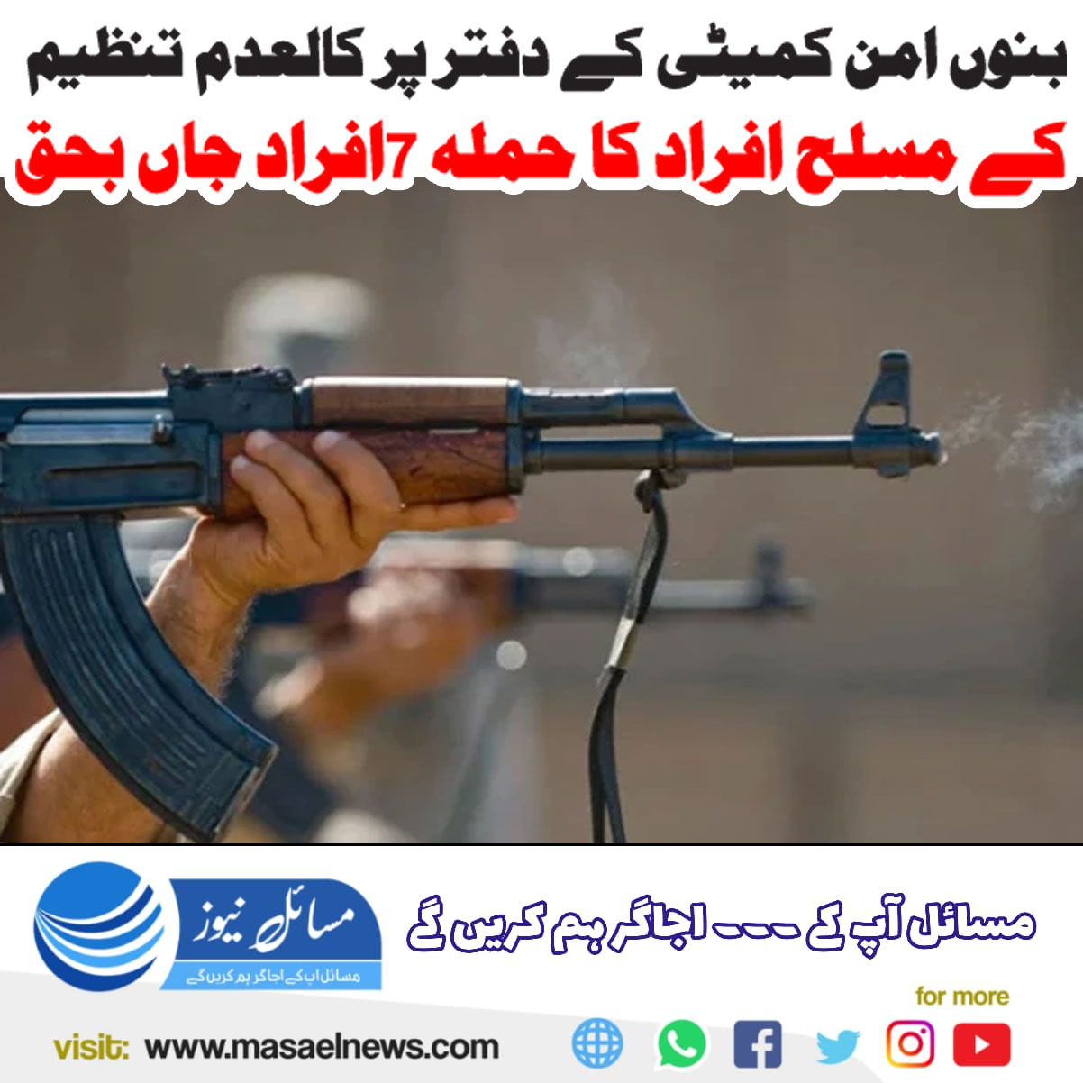 ڈیرہ اسماعیل خان(مسائل نیوز)بنوں کے علاقے ہوید دردڑیز میں امن کمیٹی کے دفتر پر کالعدم تنظیم کے مسلح افراد کے حملے میں 7 افراد جاں بحق اور ایک زخمی ہوگیا۔
