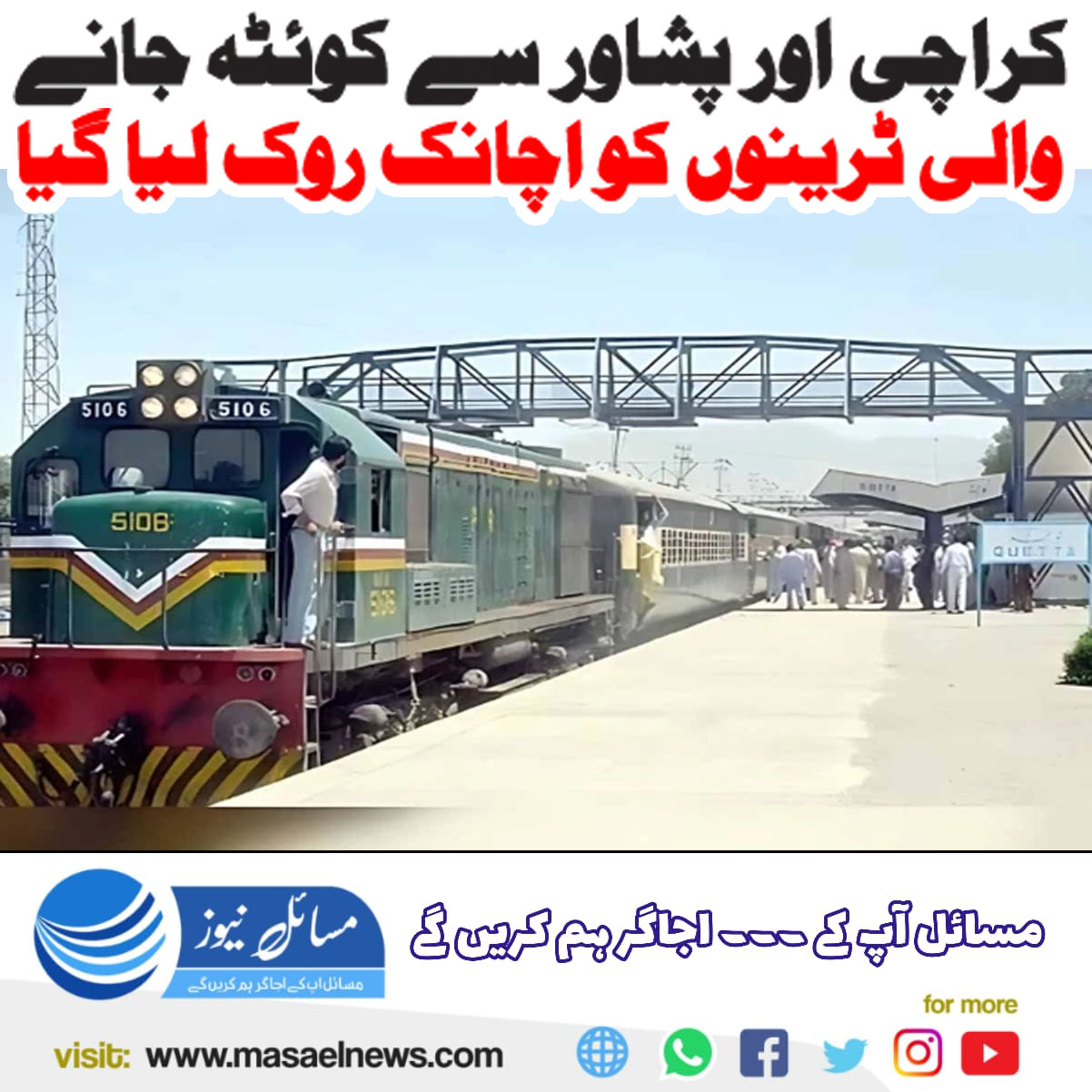 کوئٹہ(مسائل نیوز)کراچی اور پشاور سے کوئٹہ جانے والی دو ٹرینوں کو جیکب آباد ریلوے اسٹیشن پر اچانک روک لیا گیا۔