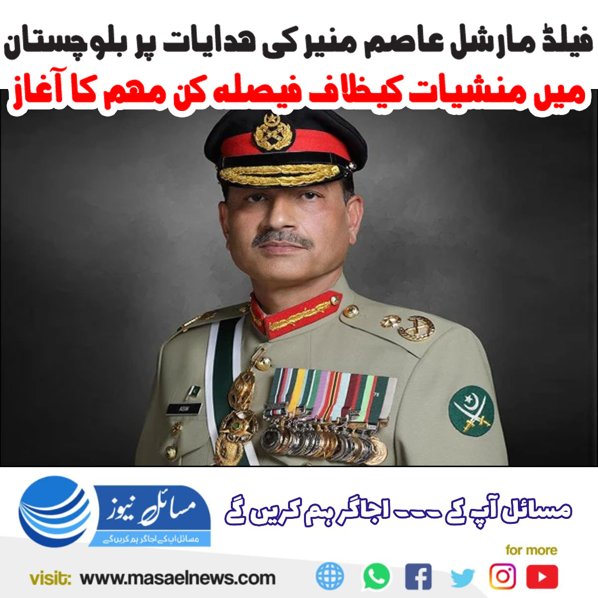 راولپنڈی (مسائل نیوز)فیلڈ مارشل سید عاصم منیر کی واضح ہدایات پر بلوچستان میں منشیات کیخلاف فیصلہ کن مہم کا آغاز کردیا گیا۔