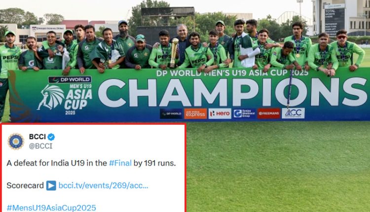 بی سی سی آئی نے میچ کے بعد اپنی ٹویٹ میں بھارت کی شکست کا ذکر کرتے ہوئے صرف یہ لکھا کہ ’انڈر 19 ایشیا کپ کے فائنل میں انڈیا کو 191 رنز سے شکست‘۔ تاہم اس ٹویٹ میں پاکستان کا نام شامل نہیں کیا گیا۔ اس عمل پر سوشل میڈیا صارفین نے بھارتی بورڈ کو تنقید کا نشانہ بنایا اور اسے کھیلوں کی روایات کے منافی قرار دیا وہیں کئی صارفین بھارتی بورڈ کا مذاق اڑاتے بھی نظر آئے۔