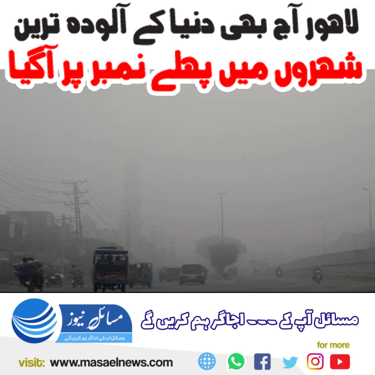 لاہور(مسائل نیوز)ایئر کوالٹی انڈیکس خطرناک حد تک بڑھنے سے لاہور آج بھی دنیا کے آلودہ ترین شہروں میں پہلے نمبر پر آگیا۔