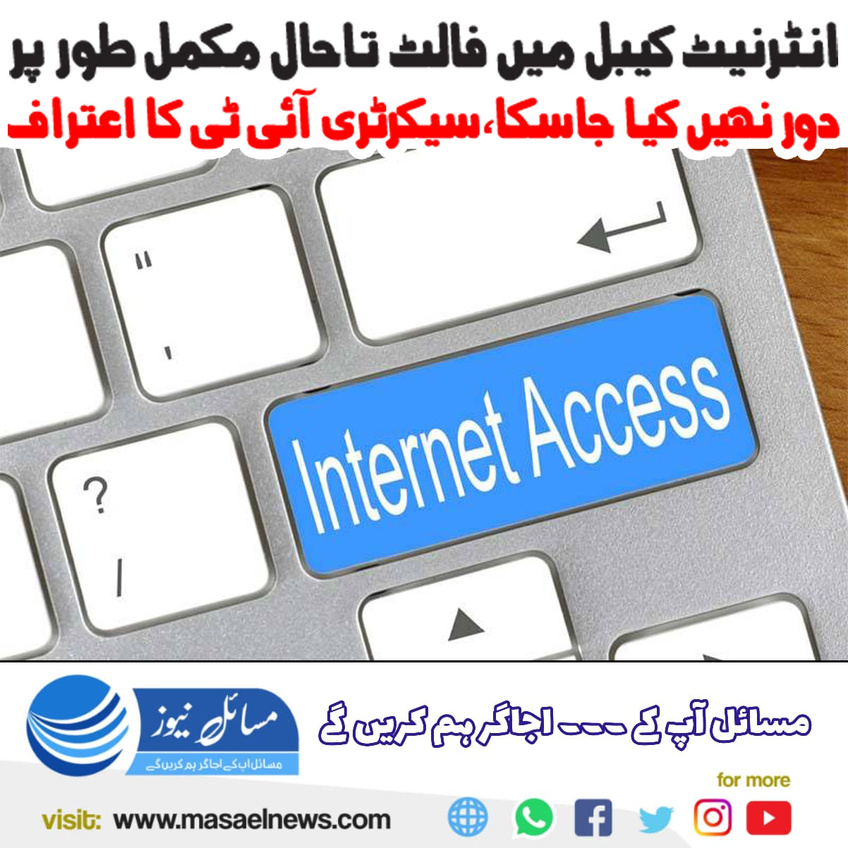 اسلام آباد(مسائل نیوز) سیکرٹری انفارمیشن ٹیکنالوجی نے اعتراف کیا ہےکہ انٹرنیٹ کیبل میں فالٹ تاحال مکمل طور پر دور نہیں کیا جاسکا ہے۔