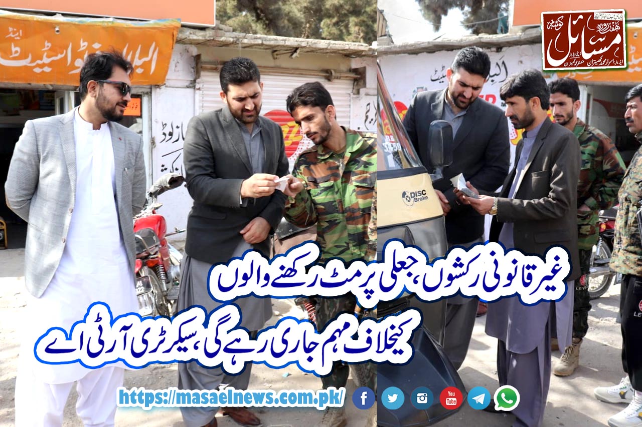 جبکہ 27رکشے ٹریفک قوانین کے خلاف ورزی کرنے پر چالان کر دیئے اس موقع پر سیکرٹری آر ٹی اے کوئٹہ نے کہا کہ شہر میں ٹریفک کی قوانین کو بہتر کرنے کےلئے غیر قانونی رکشے اور موٹر سائکل لوڈرز اور جعلی پرمٹ والے رکشوں کے خلاف روازانہ کی بنیاد پر کارروائی جاری رہے گی۔