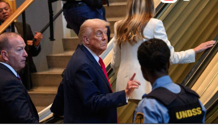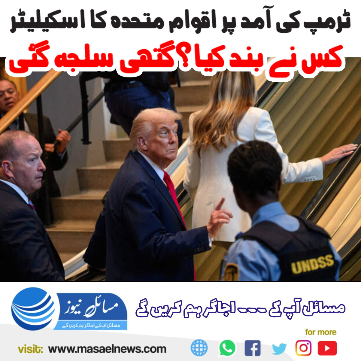گزشتہ روز صدر ٹرمپ خاتون اول میلانیا ٹرمپ کے ہمراہ جب اقوام متحدہ کے ہیڈکوارٹر پہنچے اور بالائی منزل پر جانے کے لیے اپنے عملے کے ہمرے اسکیلیٹر پر چڑھے تو اچانک اسکیلیٹر رک گیا اور صدر ٹرمپ کو میلانیا کے ساتھ سیڑھیاں چڑھنی پڑیں۔