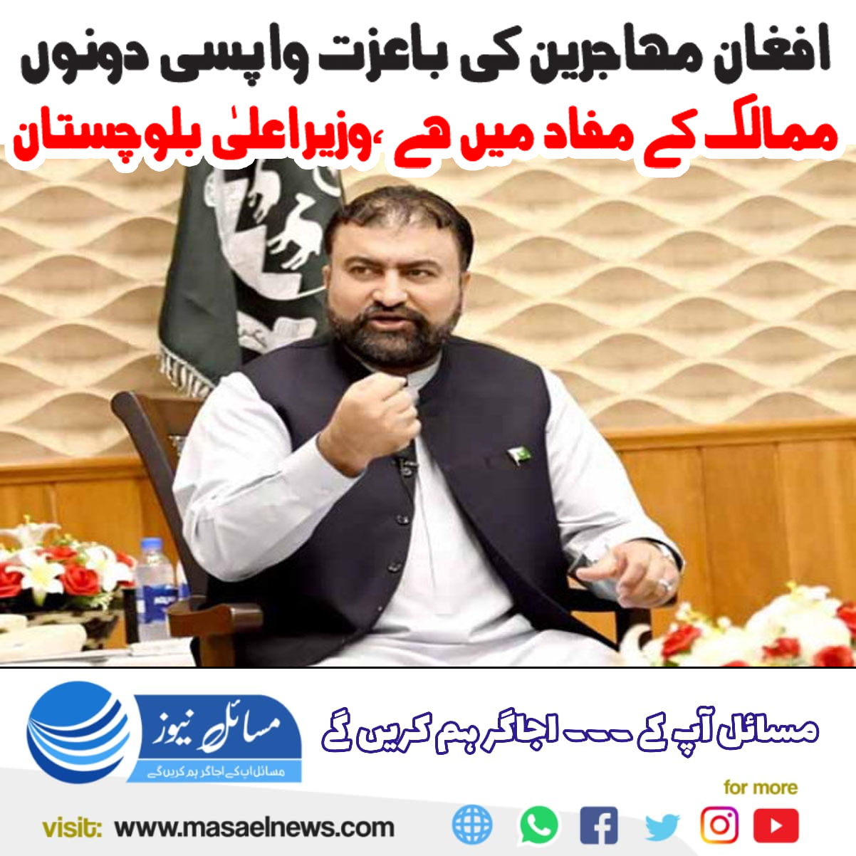انہوں نے کہا کہ افغان مہاجرین کی باعزت واپسی نہ صرف بلوچستان بلکہ دونوں برادر ممالک کے بہترین مفاد میں ہے ۔ملاقات میں رکن صوبائی اسمبلی انجینئر زمرک خان اچکزئی اور سول سوسائٹی کے نمائندے علاالدین خلجی بھی موجود تھے۔