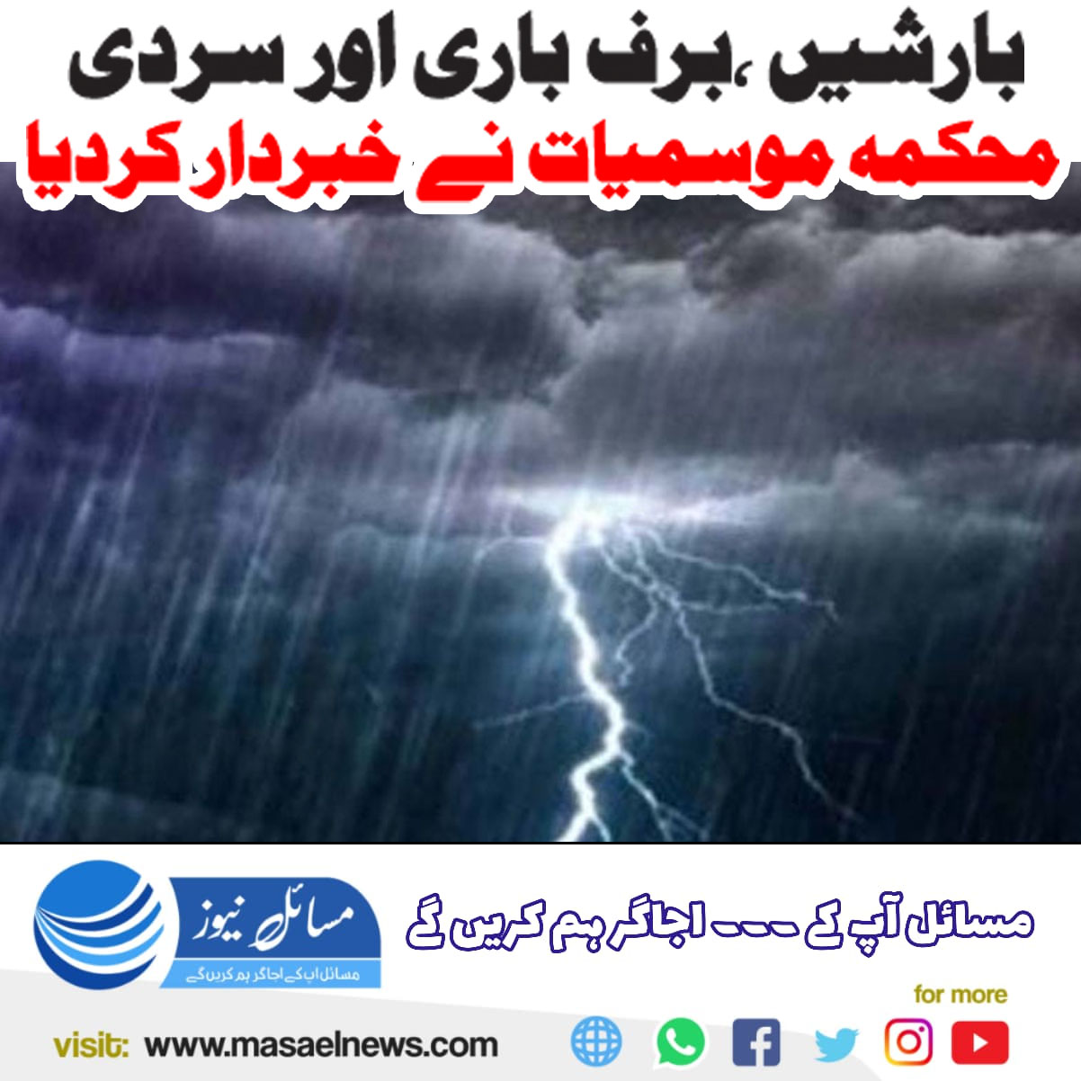 محکمہ موسمیات کے مطابق بعض مقامات پر گرج چمک کے ساتھ موسلا دھار بارشیں جبکہ بالائی علاقوں میں برف باری ہونے کی توقع ہے۔