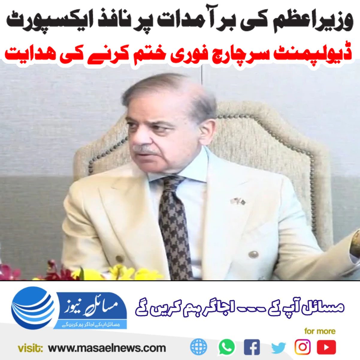اسلام آباد(مسائل نیوز)وزیراعظم شہباز شریف نے برآمدات پر نافذ ایکسپورٹ ڈیولپمنٹ سرچارج فوری ختم کرنے کی ہدایت کردی۔