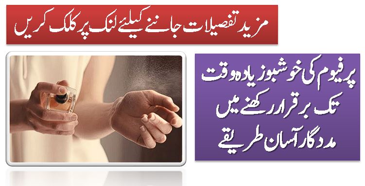 پرفیوم کو استعمال کرنا لگ بھگ ہر فرد کو پسند ہوتا ہے مگر عموماً اس کی خوشبو چند گھنٹوں بعد ختم ہو جاتی ہے۔ویسے تو کسی پرفیوم کی مہک پورا دن برقرار رکھنا لگ بھگ ناممکن ہوتا ہے، مگر چند آسان طریقوں سے خوشبو کو کافی دیر تک برقرار رکھنا ممکن ہے۔جی ہاں واقعی پرفیوم کی خوشبو کو زیادہ وقت تک برقرار رکھنا ممکن ہے، بس چند چیزوں کا خیال رکھنا ضروری ہوتا ہے۔