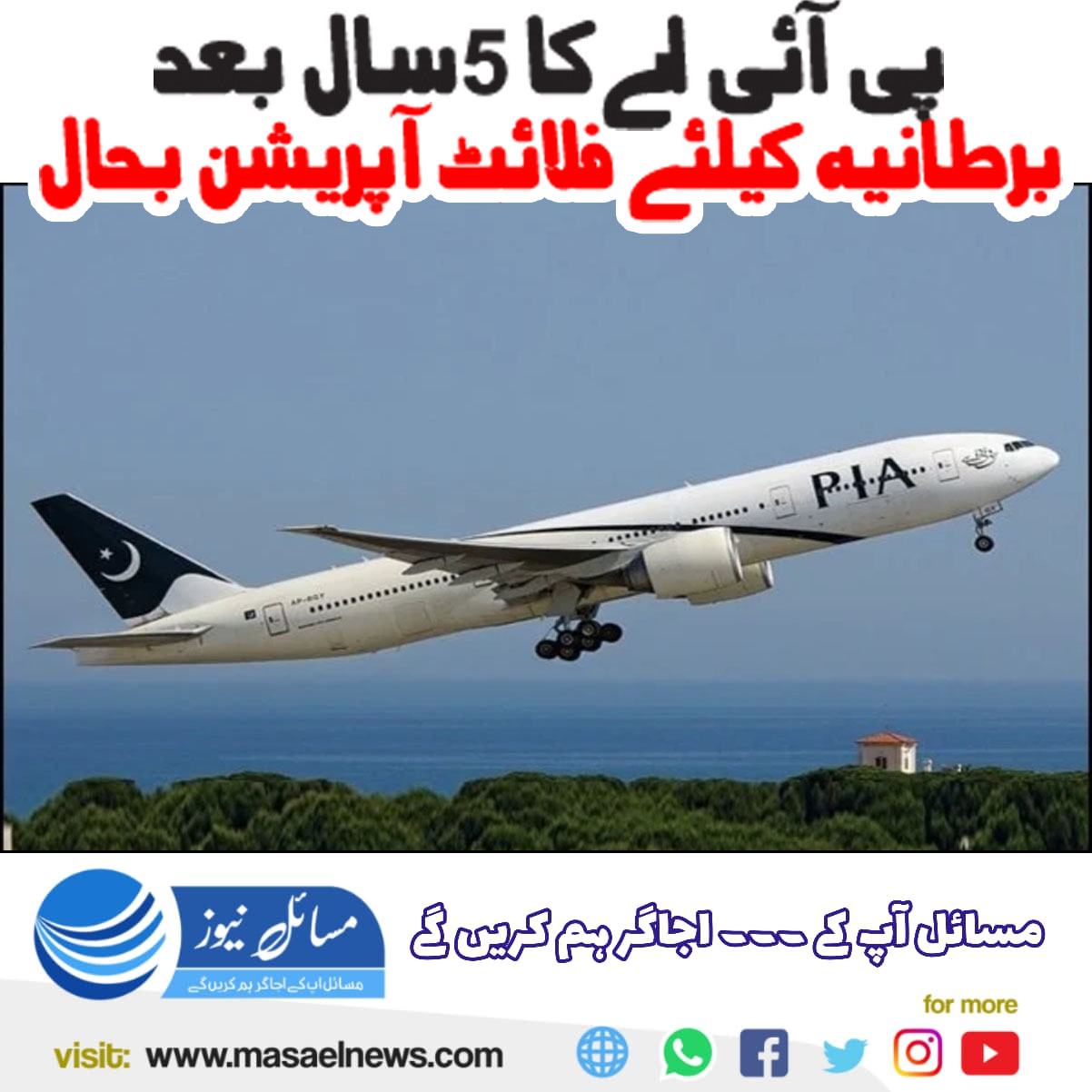 اسلام آباد(مسائل نیوز)انتظار کی گھڑیاں ختم، قومی ایئر لائنز پی آئی اے کا 5سال بعد برطانیہ کے لیے فلائٹ آپریشن بحال ہو گیا ہے، افتتاحی تقریب آج اسلام آباد اور مانچسٹر ایئر پورٹ پر منعقد ہوگی۔