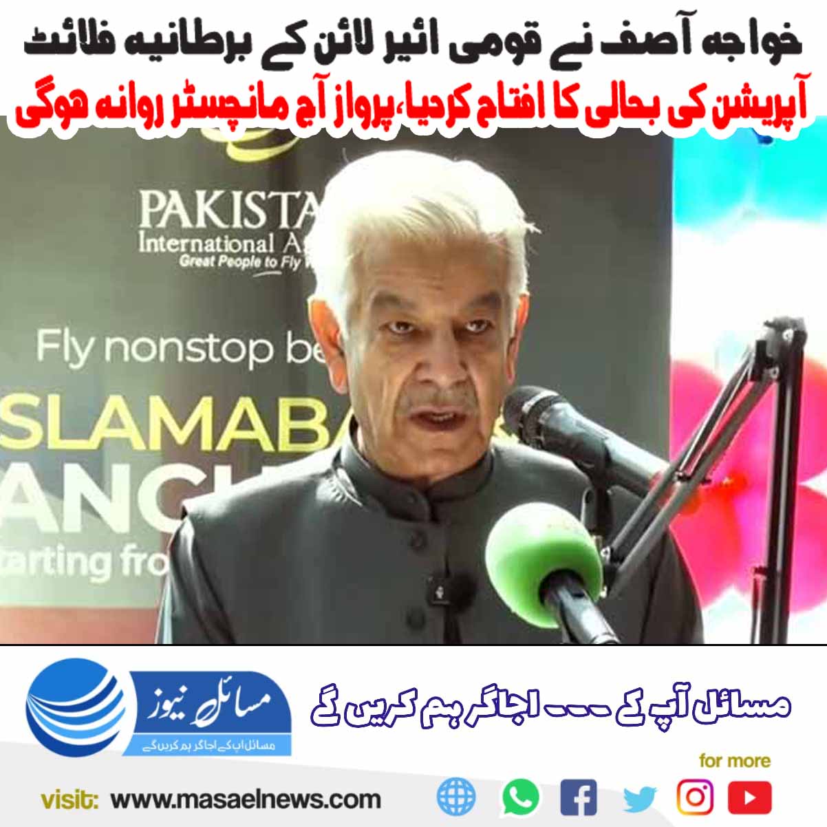 اسلام آباد(مسائل نیوز) وزیردفاع خواجہ آصف نے قومی ائیر لائن کے برطانیہ فلائٹ آپریشن بحالی کا افتتاح کردیا۔