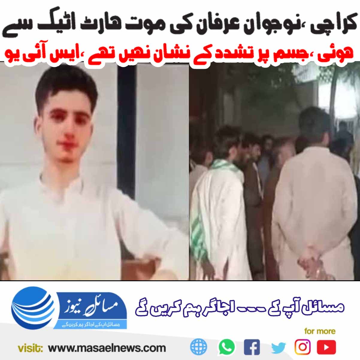 حکام نے مزید بتایا کہ عرفان کا پوسٹ مارٹم مجسٹریٹ کی موجودگی میں کروایاگیا اور پوسٹ مارٹم کی مکمل رپورٹ آنے پر تفصیلات سامنےآئیں گیں۔