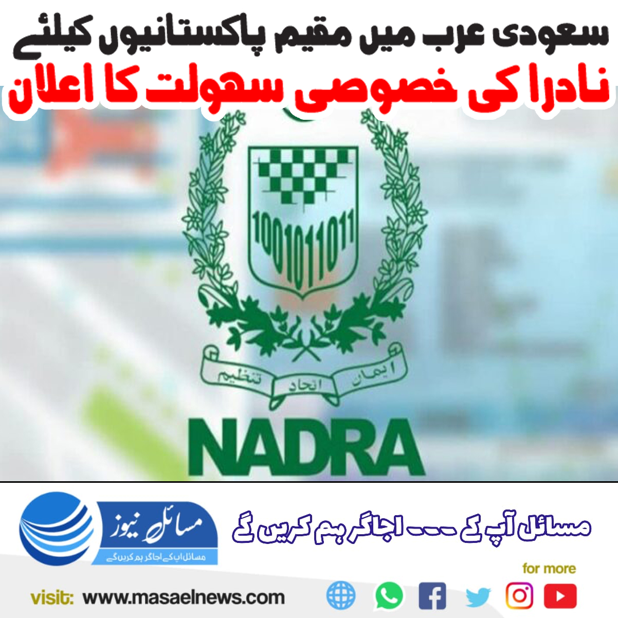 اسلام آباد(مسائل نیوز) نیشنل ڈیٹا بیس اینڈ رجسٹریشن اتھارٹی (نادرا) نے سعودی عرب میں مقیم پاکستانیوں کے لیے ایک خصوصی سہولت کا اعلان کیا ہے۔