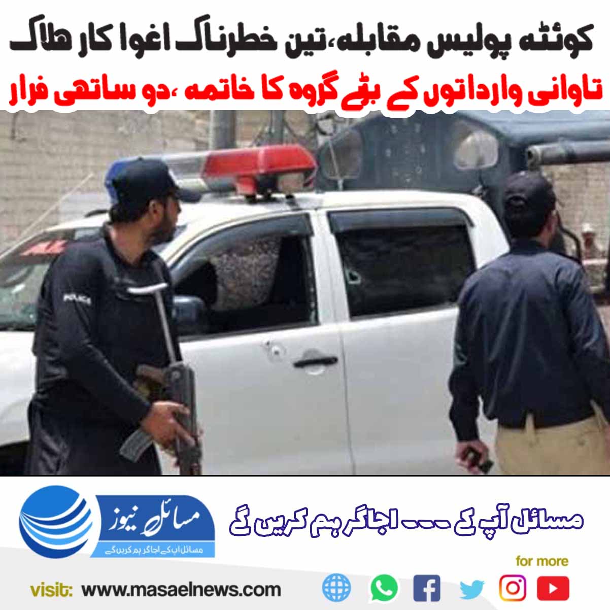 کوئٹہ پولیس مقابلہ — تین خطرناک اغوا کار ہلاک، تاوانی وارداتوں کے بڑے گروہ کا خاتمہ — اسلحہ و گاڑی برآمد، دو ساتھی فرار