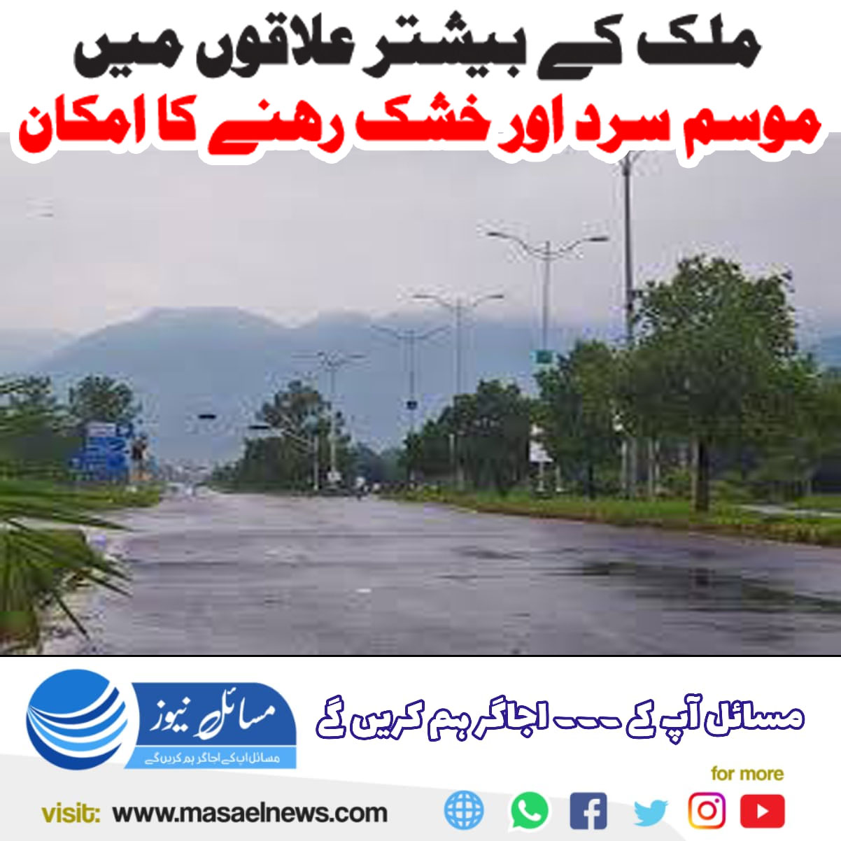 محکمہ موسمیات کے مطابق اسلام آباد اورگردونواح میں موسم سرد اورخشک رہےگا، خیبرپختونخوا کےبیشتر اضلاع میں موسم سرد اورخشک رہے گا، پنجاب کے بیشتر اضلاع میں موسم سرد اورخشک رہنےکی توقع ہے۔