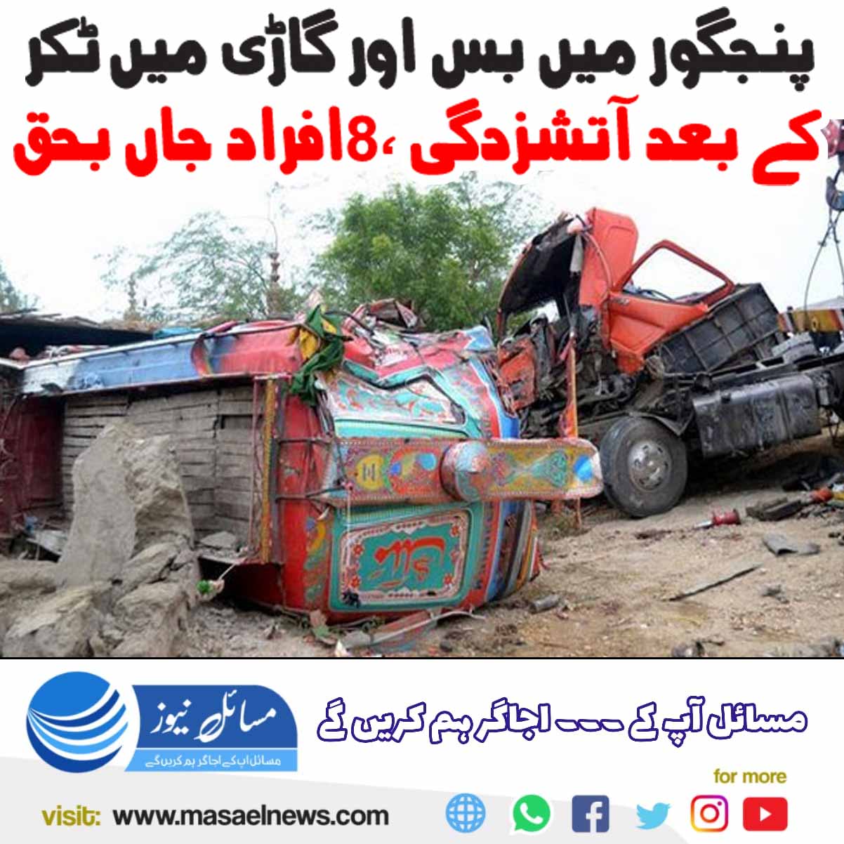 ؎پنجگور(مسائل نیوز)پنجگور بازار میں بس اور گاڑی میں ٹکر کے بعد دونوں گاڑیوں میں آگ بھڑک اٹھی جس کے نتیجے میں 8 افراد جاں بحق ہو گئے۔