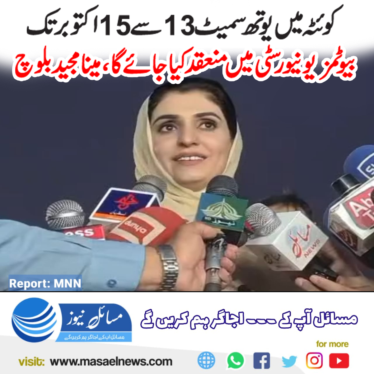 کوئٹہ میں یوتھ سمیٹ 13 سے 15 اکتوبر تک بیوٹمز یونیورسٹی میں منعقد کیا جائے گا، مینا مجید بلوچ