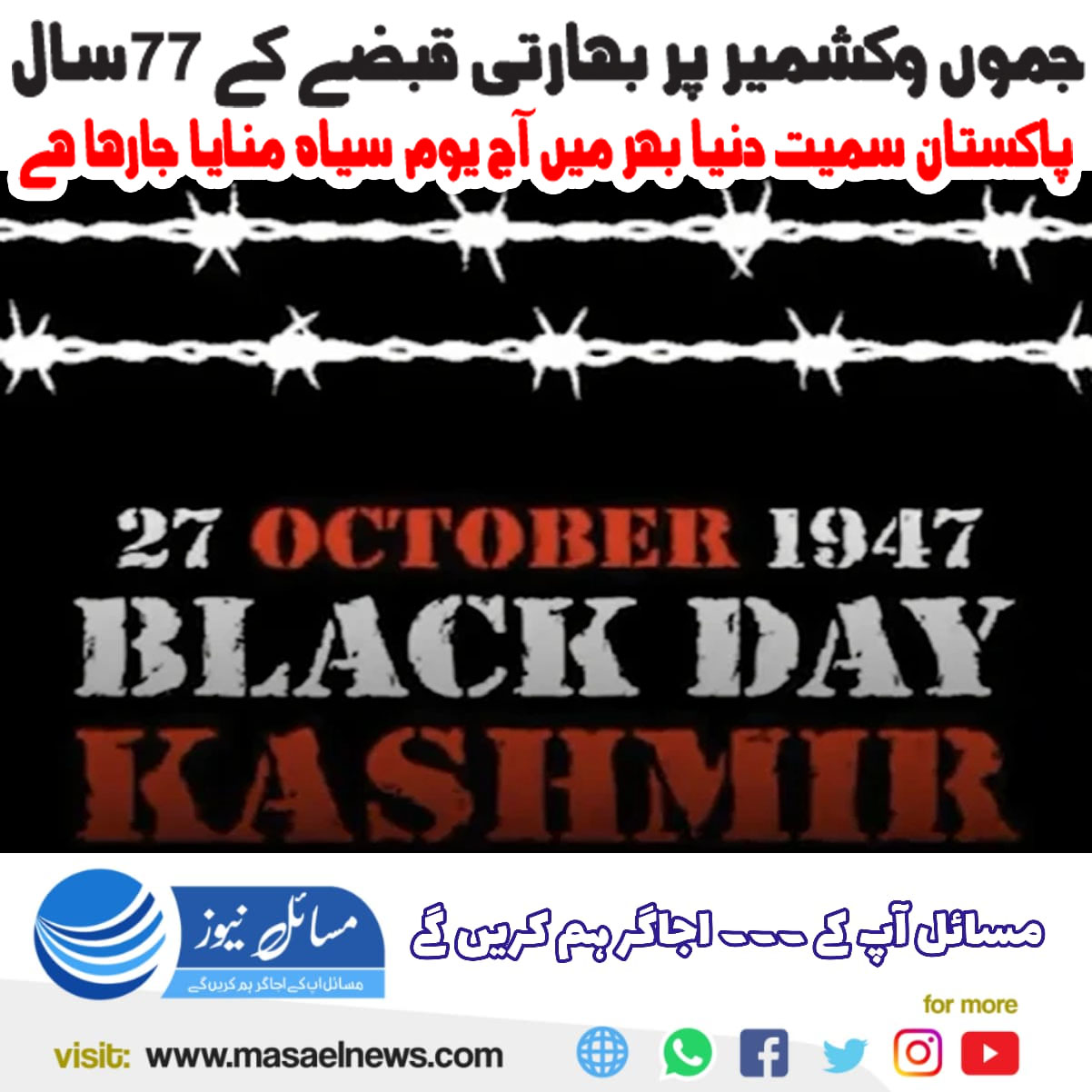 اسلام آباد(مسائل نیوز)مقبوضہ جموں و کشمیر پر بھارتی قبضے کے 77 سال مکمل ہونے پر آج پاکستان، آزاد کشمیر، گلگت بلتستان اور دنیا بھر میں یومِ سیاہ بھرپور انداز میں منایا جا رہا ہے۔