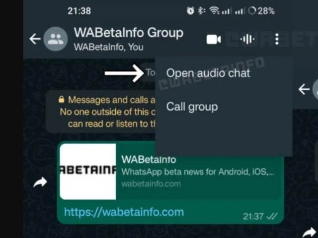 واٹس ایپ کی خبر دینے والی ویب سائٹ ’ویب بی ٹا انفو‘ کے مطابق آڈیو چیٹ میں بعض بالکل نئی تبدیلیاں پیش کی جارہی ہیں۔ ان میں جلد ٹویٹر اسپیسِس جیسی سہولیات پیش کی جائیں گی۔ بی ٹا ورژن 2.23.7.12 کے مطابق واٹس ایپ کال کا نیا انٹرفیس پیش کیا جائے گا۔ کال بٹن کی جگہ لہردار لوگو پیش کیا جائے گا۔ یہ لوگو مینو میں سب سے بلند دکھائی دے گا۔ اس طرح اوپر کی آڈیو بار کو بڑھا گیا ہے۔