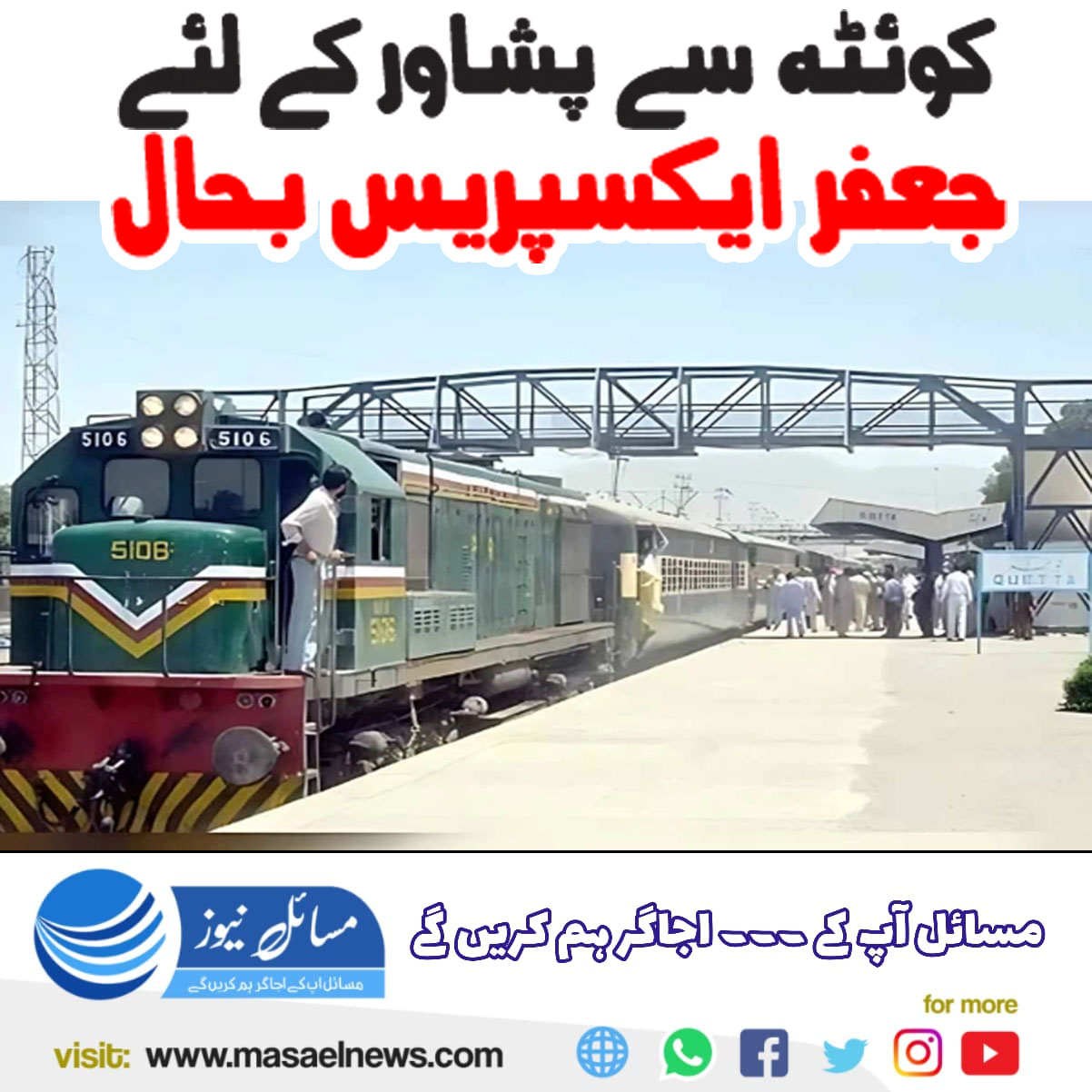 کوئٹہ(مسائل نیوز)کوئٹہ سے پشاور جانے والی جعفر ایکسپریس کو 5 روز بعد بحال کر دیا گیا۔