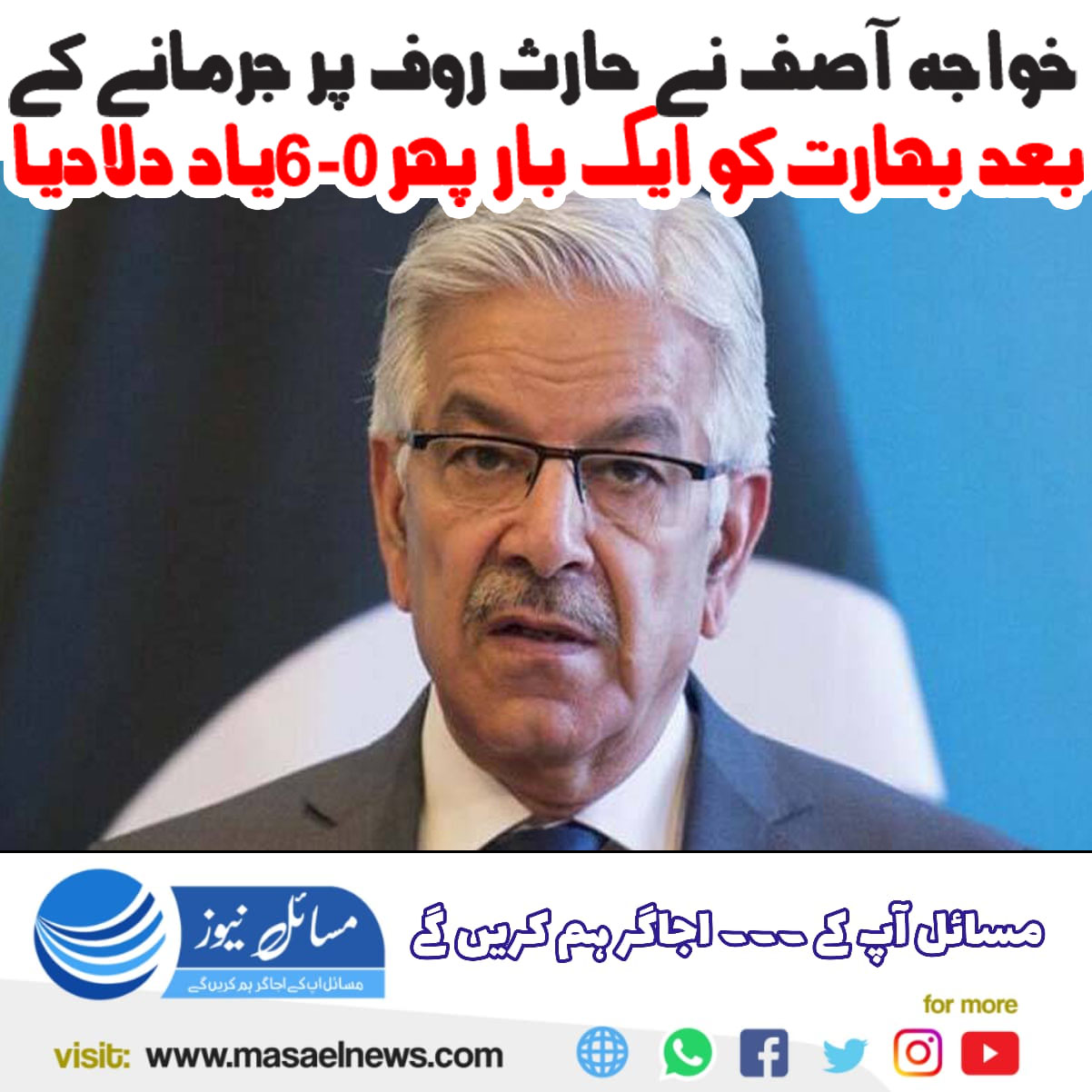 خواجہ آصف نے حارث رؤف پر جرمانے کے بعد بھارت کو ایک بار پھر 0-6 یاد دلادیا