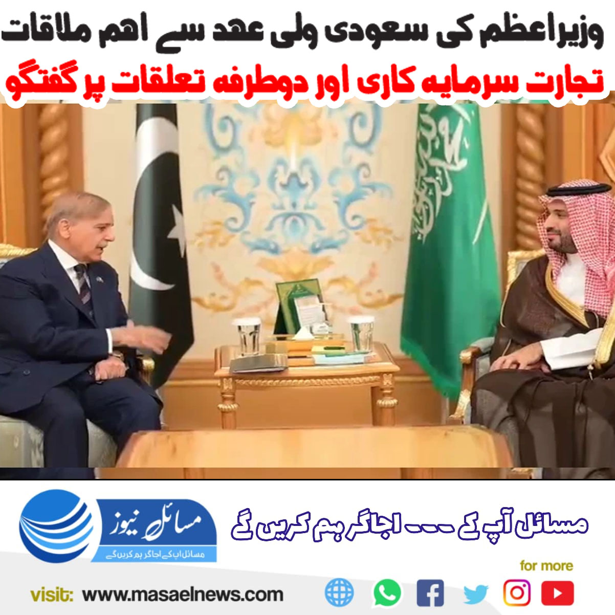 اسلام آباد(مسائل نیوز)وزیرِ اعظم محمد شہباز شریف نے ریاض میں سعودی ولی عہد محمد بن سلمان سے خوشگوار ماحول میں ملاقات کی۔