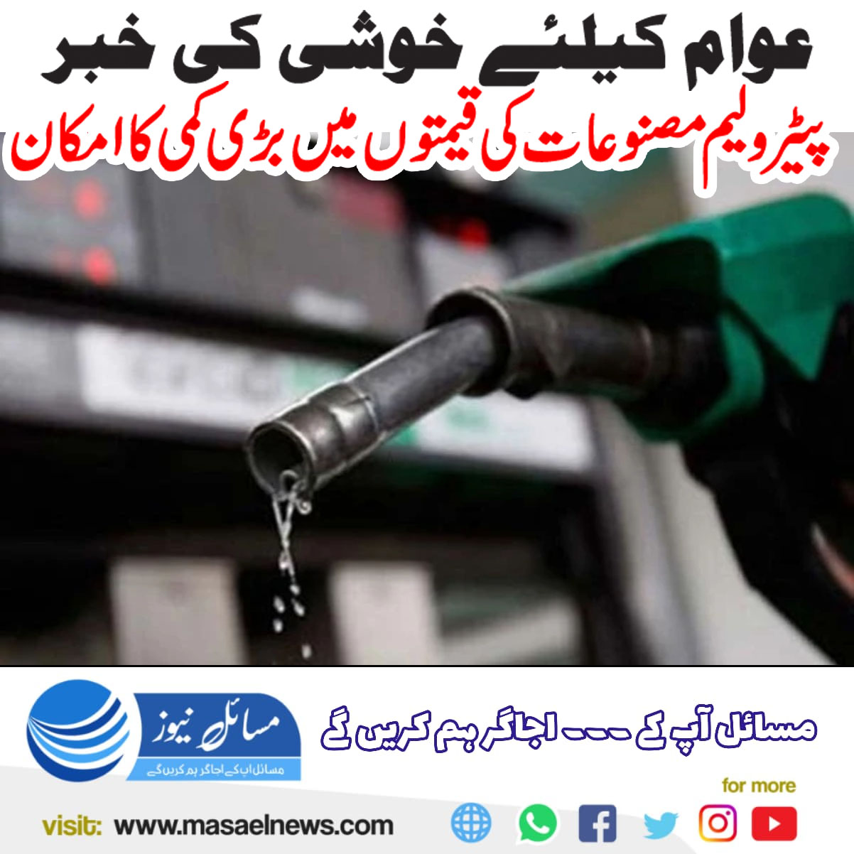 اسلام آباد(مسائل نیوز)عوام کے لیے خوشی کی خبر ہے کہ پیٹرولیم مصنوعات کی قیمتوں میں بڑی کمی کا امکان ہے۔