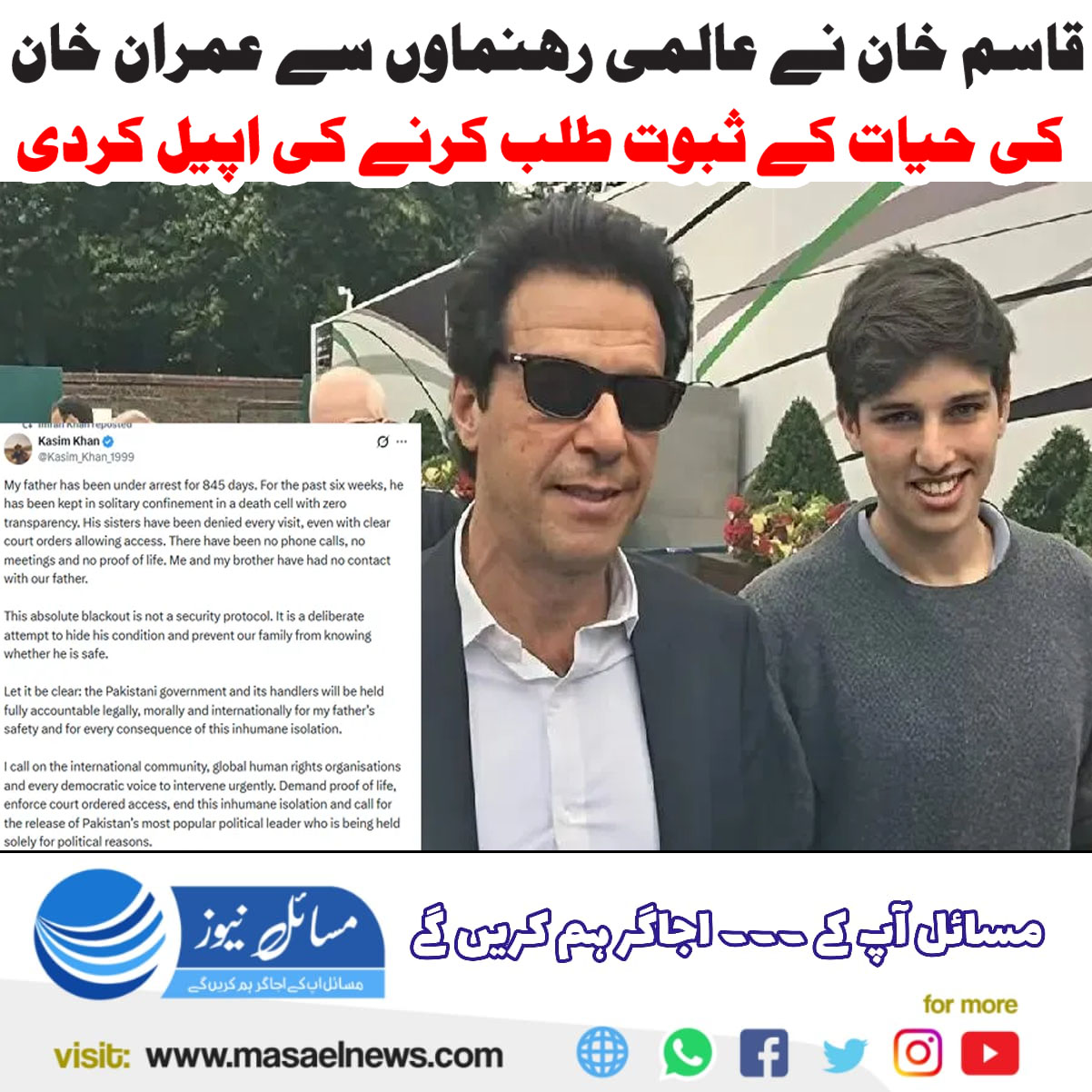 اسلام آباد(مسائل نیوز)سابق وزیراعظم عمران خان کے صاحبزادے قاسم خان نے عالمی برادری اور انسانی حقوق کی تنظیموں سے فوری اپیل کی ہے کہ وہ حکومت پاکستان پر دباؤ ڈالیں تاکہ ان کے والد کی حیات کے ثبوت فراہم کیے جائیں۔