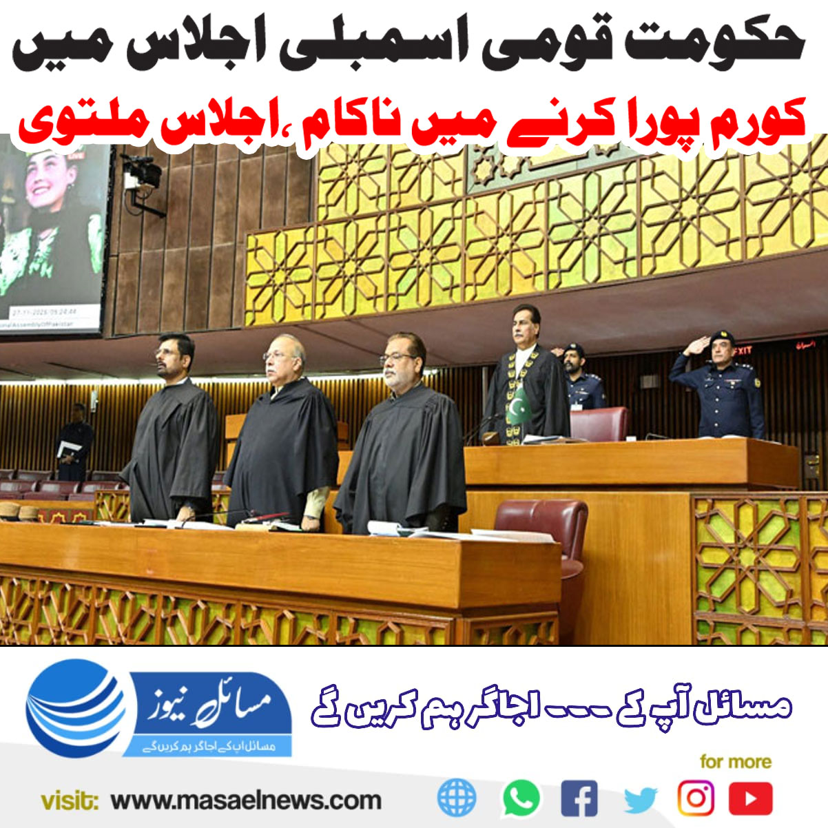 اسلام آباد(مسائل نیوز)حکومت قومی اسمبلی اجلاس میں کورم پورا کرنے میں ناکام ہو گئی جس کے باعث اجلاس ملتوی کرنا پڑ گیا۔