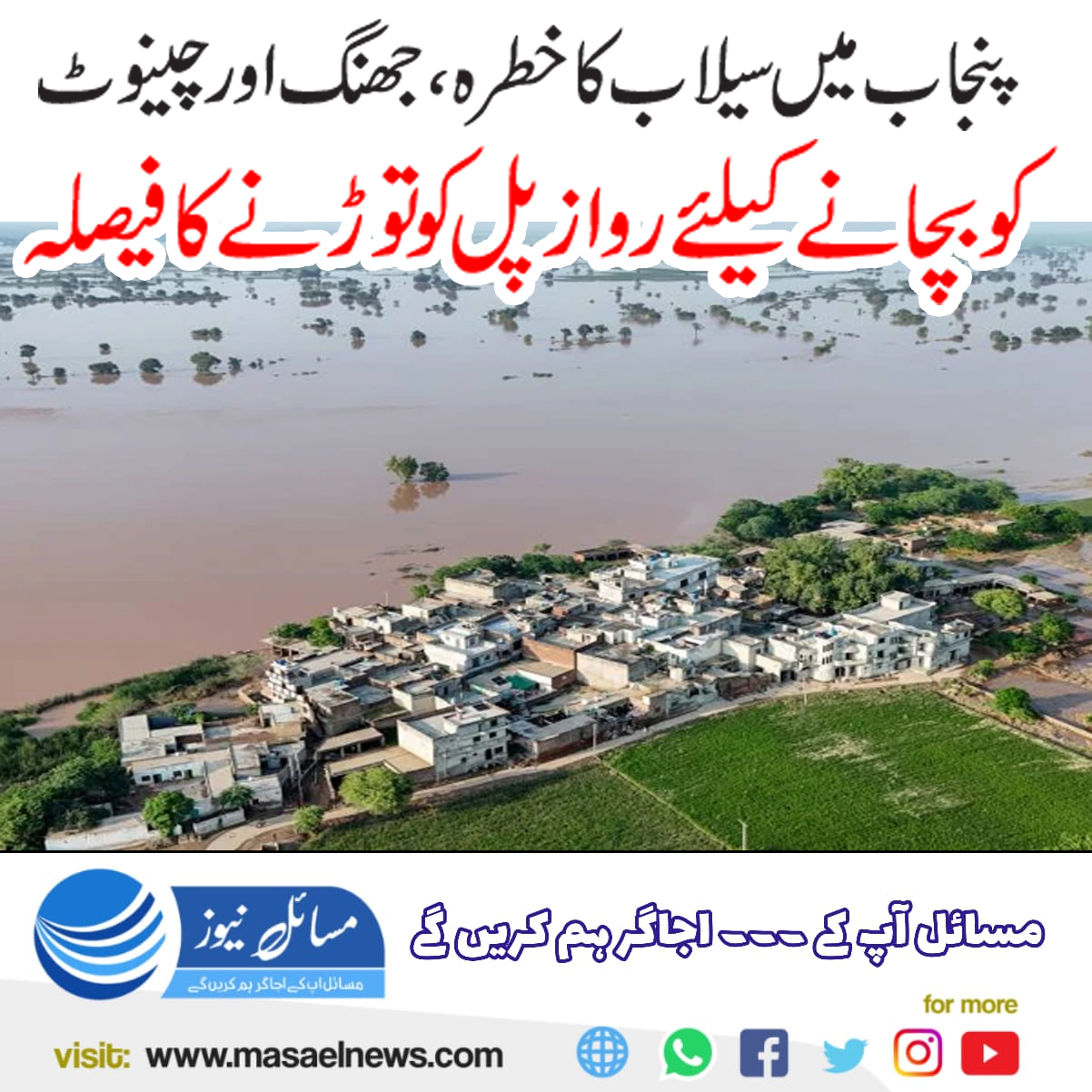 لاہور(مسائل نیوز)دریائے چناب، راوی اور ستلج میں سیلابی ریلے کے باعث پنجاب کے دو شہروں جھنگ اور چنیوٹ کو بچانے کے لیے رواز پل کو توڑنے کا فیصلہ کر لیا گیا۔