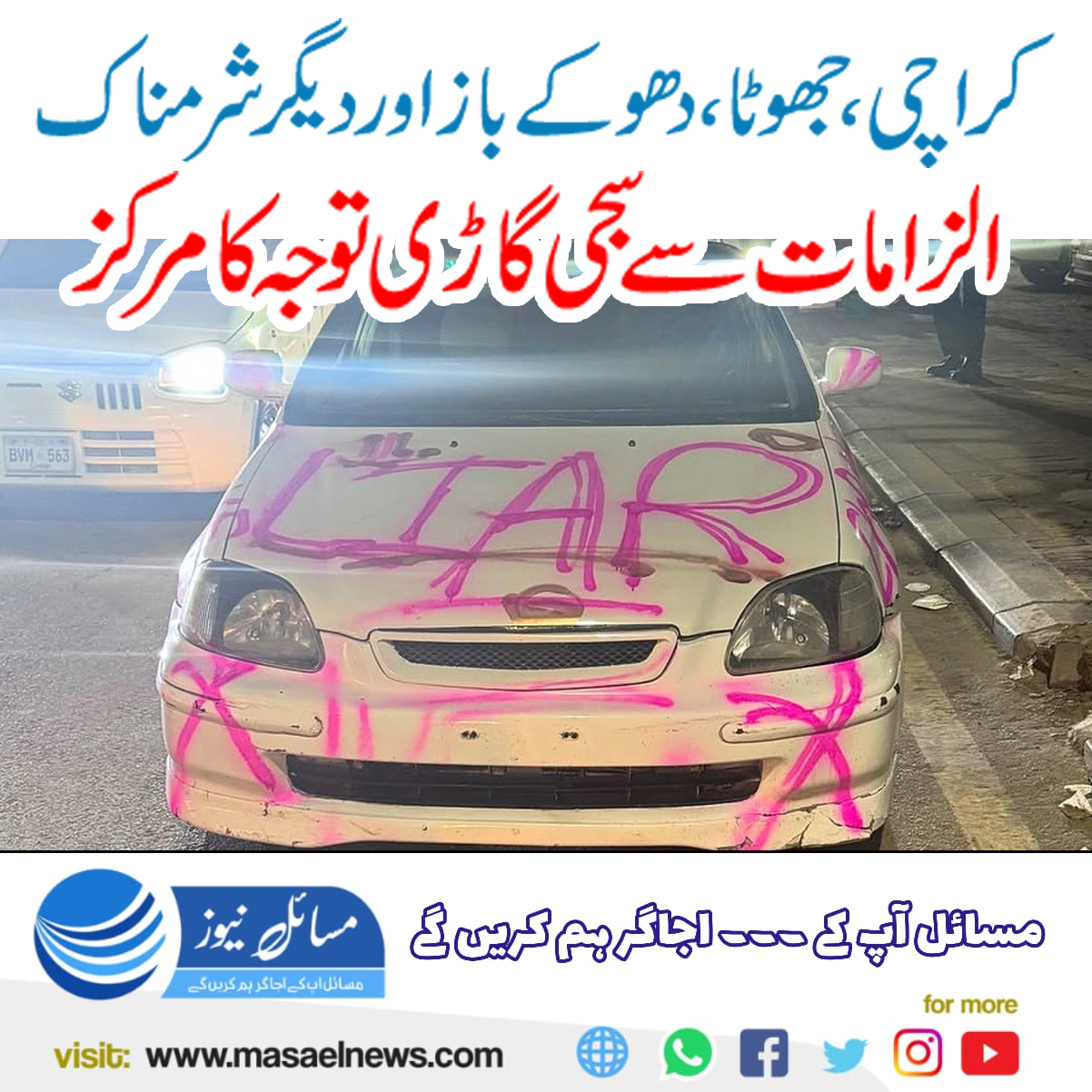 کراچی (مسائل نیوز)کراچی کی سڑکوں پر ایک انوکھی اور متنازعہ گاڑی شہریوں کی توجہ کا مرکز بنی ہوئی ہے۔ اس کار کے چاروں اطراف پر بڑے بڑے حروف میں جھوٹا اوردھوکے باز جیسے الفاظ لکھے گئے ہیں جس کے باعث یہ منظر دیکھتے ہی دیکھتے شہر بھر میں موضوعِ بحث بن گیا ہے۔