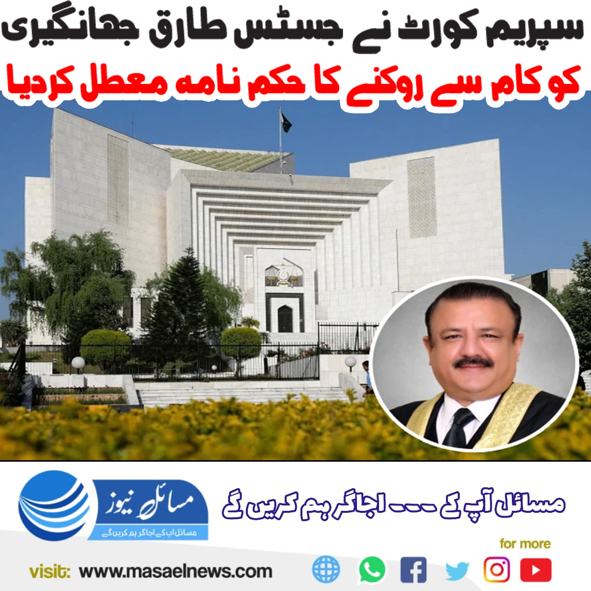 اسلام آباد(مسائل نیوز)سپریم کورٹ آف پاکستان نے جسٹس طارق جہانگیری کو کام سے روکنے کا حکمنامہ معطل کردیا۔