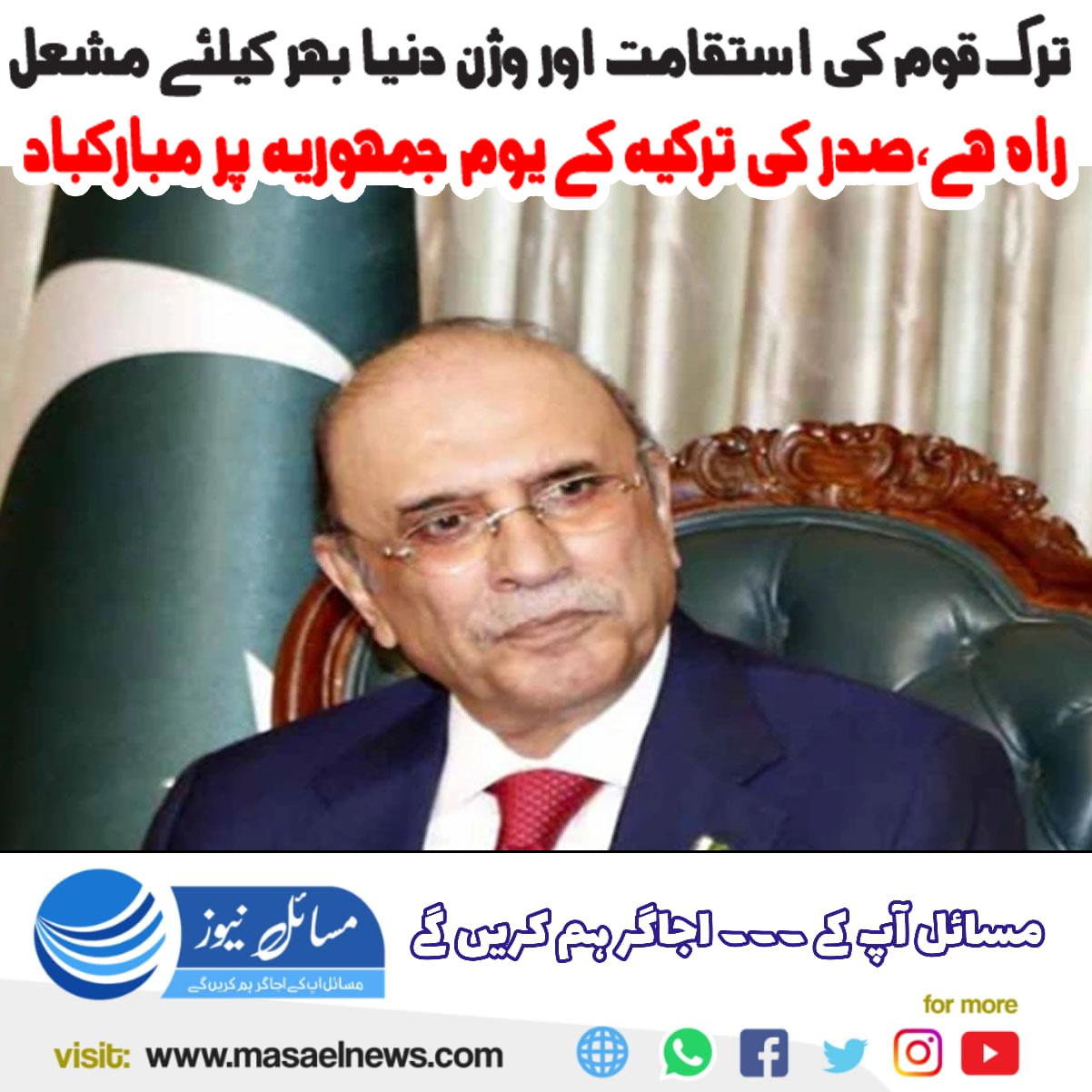 اسلام آباد)مسائل نیوز)صدر آصف علی زرداری کا کہنا ہے کہ ترک قوم کی استقامت اور وژن دنیا بھر کے لیے مشعلِ راہ ہے، مصطفیٰ کمال اتاترک کی قیادت نے اصلاحات و ترقی کی نئی راہیں کھولیں۔
