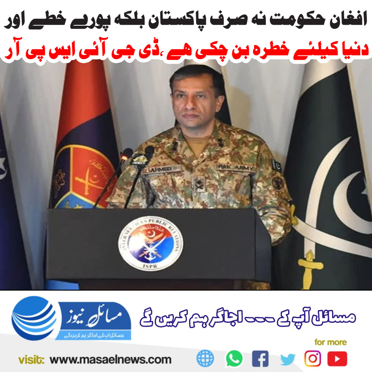 راولپنڈی (مسائل نیوز)ڈائریکٹر جنرل (ڈی جی) انٹر سروسز پبلک ریلیشن (آئی ایس پی آر) لیفٹیننٹ جنرل احمد شریف چوہدری نے کہا ہے کہ امریکی افواج انخلا کے دوران 7.2 بلین ڈالرز کا امریکی فوجی ساز و سامان افغانستان چھوڑ گئی ہیں، افغان رجیم نہ صرف پاکستان بلکہ پورے خطے اور دنیا کیلئے ایک خطرہ بن چکا ہے-