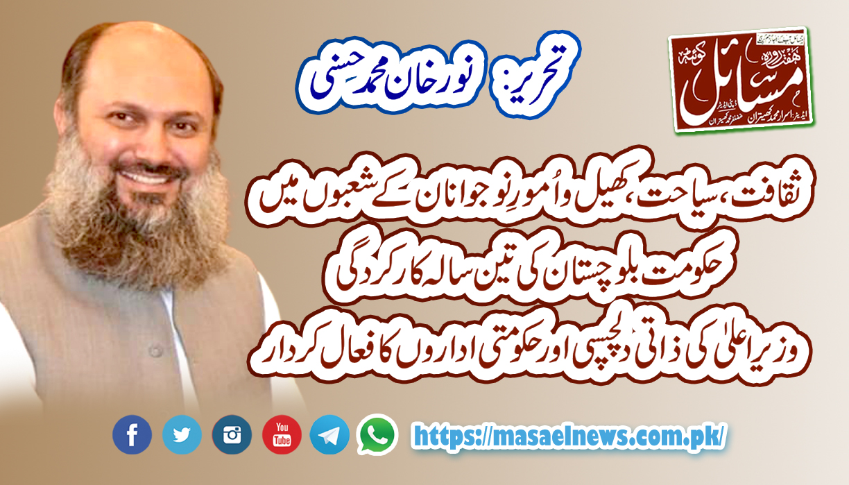 موجودہ صوبائی مخلوط حکومت نے وزیر اعلیٰ بلوچستان جام کمال خان عالیانی کی قیادت میں صوبے کی ہمہ جہت ترقی کے لیے مختلف شعبوں میں مربوط اقدامات کے ذریعے عوام کو بہتر سہولتوں کی فراہمی، معیشت کو مضبوط بنانے کے لیے مختلف شعبوں میں پائیدار ترقی کو وسعت دینے کا آغاز کردیا ہے۔ ان اقدامات کے ثمرات بہت جلد عوام کو خوشگوار تبدیلی کی صورت میں نظر آئیں گے۔بہتر منصوبہ بندی، سرکاری ترقیاتی فنڈز کے مﺅثر استعمال کے ذریعے مثبت نتائج کا حصول موجودہ حکومت کی اولین ترجیح ہے۔ ایسے شعبے جن کی اہمیت مسلّم ہے اور ماضی میں ان کو بوجوہ نظر انداز کیا گیا ان پر خصوصی توجہ دی جارہی ہے۔ان میں ثقافت، سیاحت، کھیل اور امورِ نوجوانان کے شعبے شامل ہیں۔