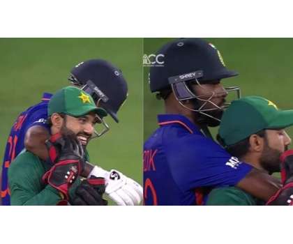 بھارتی آل راؤنڈر ہاردیک پانڈیاکی بیٹنگ اور بولنگ کے ساتھ میچ کے دوران قومی وکٹ کیپر بلے باز محمد رضوان کو پیچھے سے گلے لگانے کے عمل کا خوب چرچہ ہو رہا ہے۔ میچ کے دوران ہاردیک پانڈیا نے اچانک محمد رضوان کو گلے لگایا تھا، اس عمل پر محمد رضوان ہنس دیے تھے۔