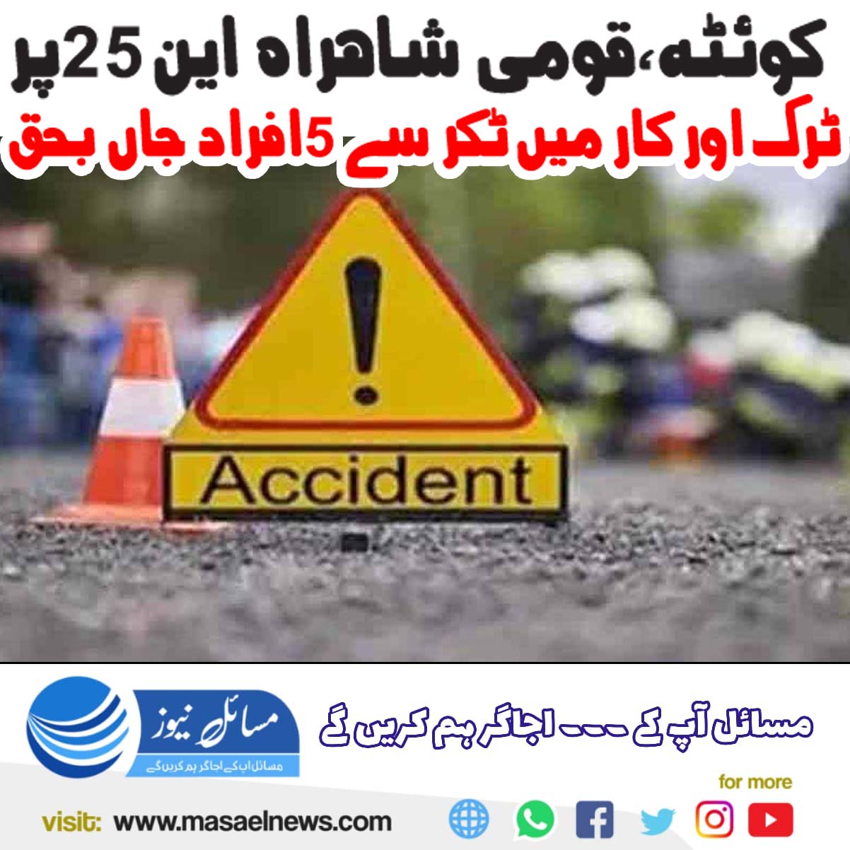کوئٹہ(مسائل نیوز) کوئٹہ میں قومی شاہراہ پر ٹرک اور کار میں ٹکر کے باعث 5 افراد جاں بحق ہوگئے۔