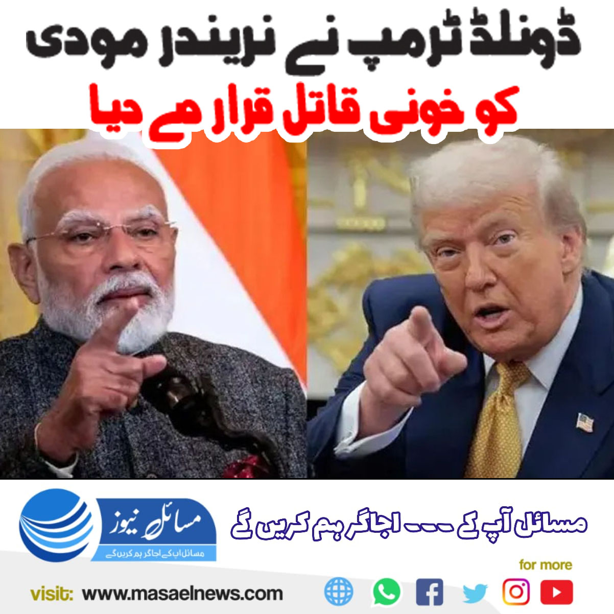 امریکی صدر ڈونلڈ ٹرمپ نے اپنے بیان میں کہا کہ مودی دیکھنے میں اچھا مگر اندر سے قاتل جیسا سخت انسان ہے، ٹرمپ نے مودی کی نقل اتارتے ہوئے طنزیہ انداز میں کہا کہ ”نہیں، ہم لڑیں گے!“