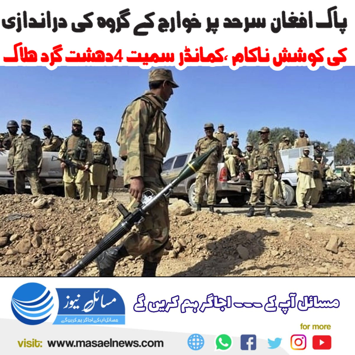 پشاور(مسائل نیوز) سکیورٹی فورسز نے پاک افغان سرحد پرخوارج کے گروہ کی دراندازی کی کوشش ناکام بناتے ہوئے خارجی کمانڈر سمیت 4 دہشتگردوں کو ہلاک کردیا۔