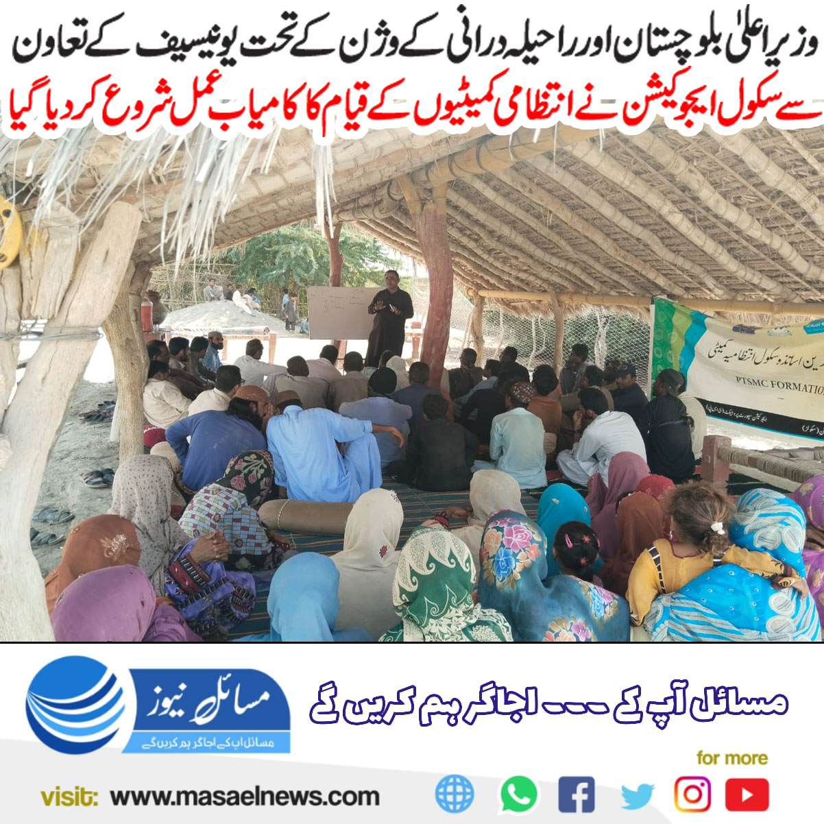 وزیر اعلیٰ بلوچستان اور راحیلہ حمید درانی کے وژن کے تحت، یونیسیف اور یورپی یونین کے تعاون سے سکول ایجوکیشن ڈیپارٹمنٹ نے صوبے بھر میں والدین، اساتذہ انتظامی کمیٹیوں (PTSMCs) کے قیام کا کامیاب عمل شروع کردیا