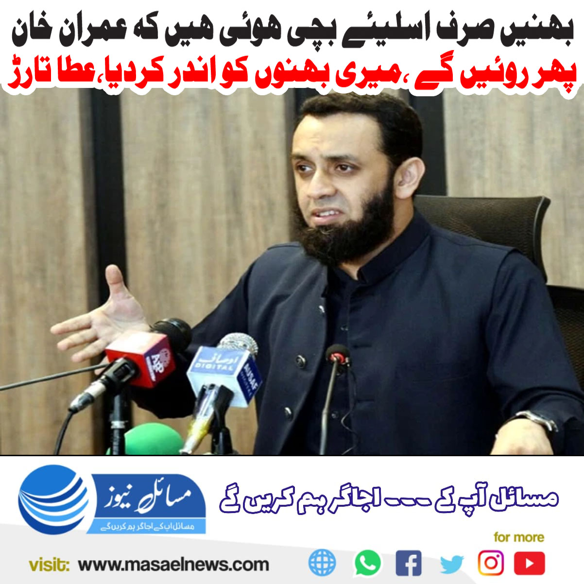 اسلام آباد(مسائل نیوز)وفاقی وزیر اطلاعات عطا تارڑ نے کہا ہے کہ عمران خان کی تینوں بہنوں کو ابھی تک صرف اسلیے کیفرکردار تک نہیں پہنچایا کہیں یہ رونا نہ روئیں کہ میری بہنوں کو اندر کردیا۔