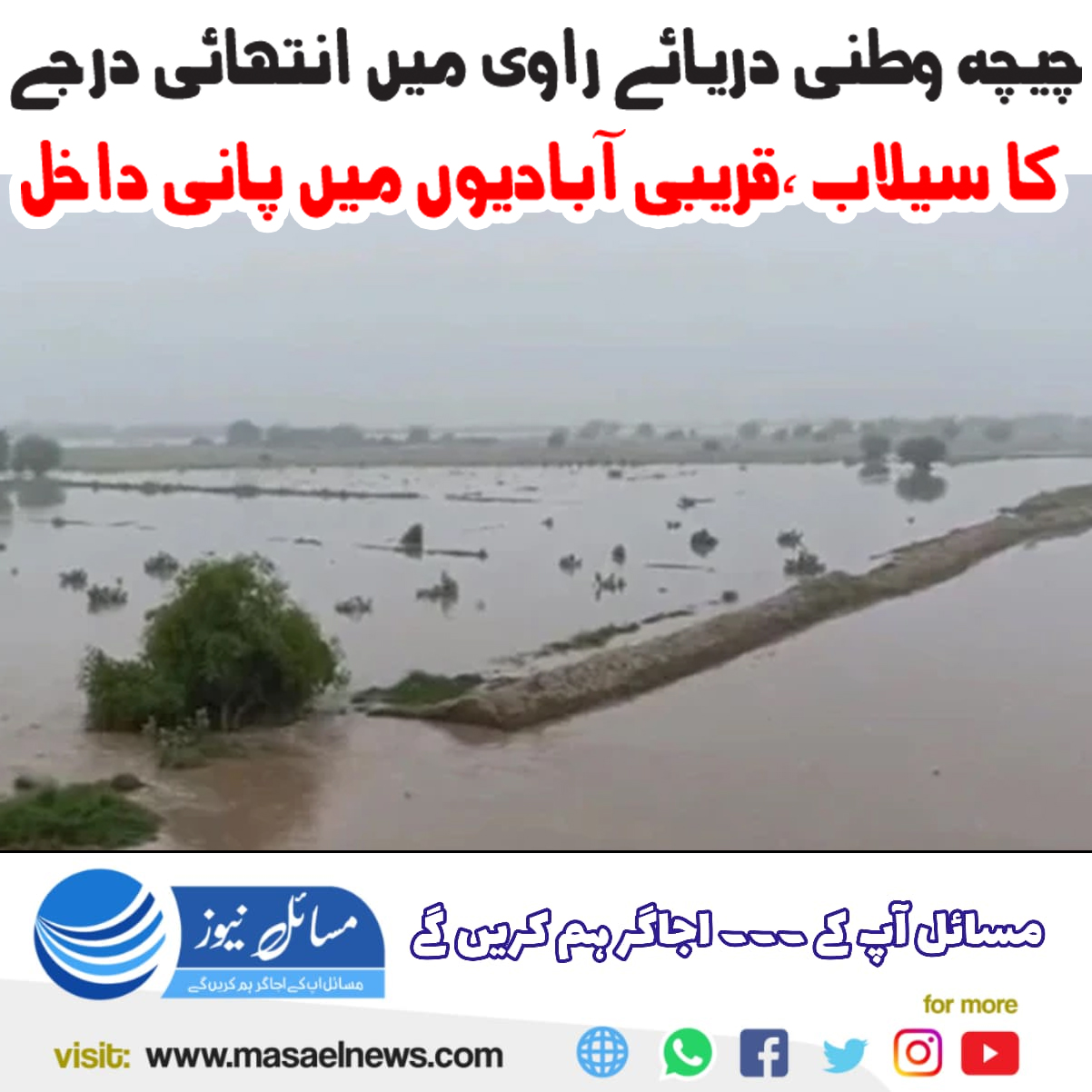 چیچہ وطنی(مسائل نیوز)چیچہ وطنی کے قریب دریائے راوی میں انتہائی اونچے درجے کا سیلاب آ گیا ہے، جس سے مقامی آبادیوں میں شدید نقصان کا خطرہ پیدا ہو گیا ہے۔