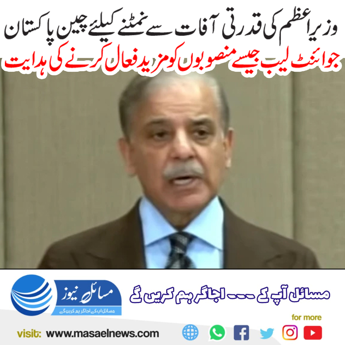 اسلام آباد(مسائل نیوز)قدرت روزنامہ)وزیر اعظم شہباز شریف نے کہا ہے کہ قدرتی آفات سے نمٹنے کے لیے پاکستان میں موجود بین الاقوامی میڈیکل سینیٹر اور چین پاکستان جوائنٹ لیب جیسے منصوبوں کو مزید فعال بنایا جائے اور اس ضمن میں چین اور پاکستان کی مابین شراکت داری کو مزید توسیع دی جائے۔