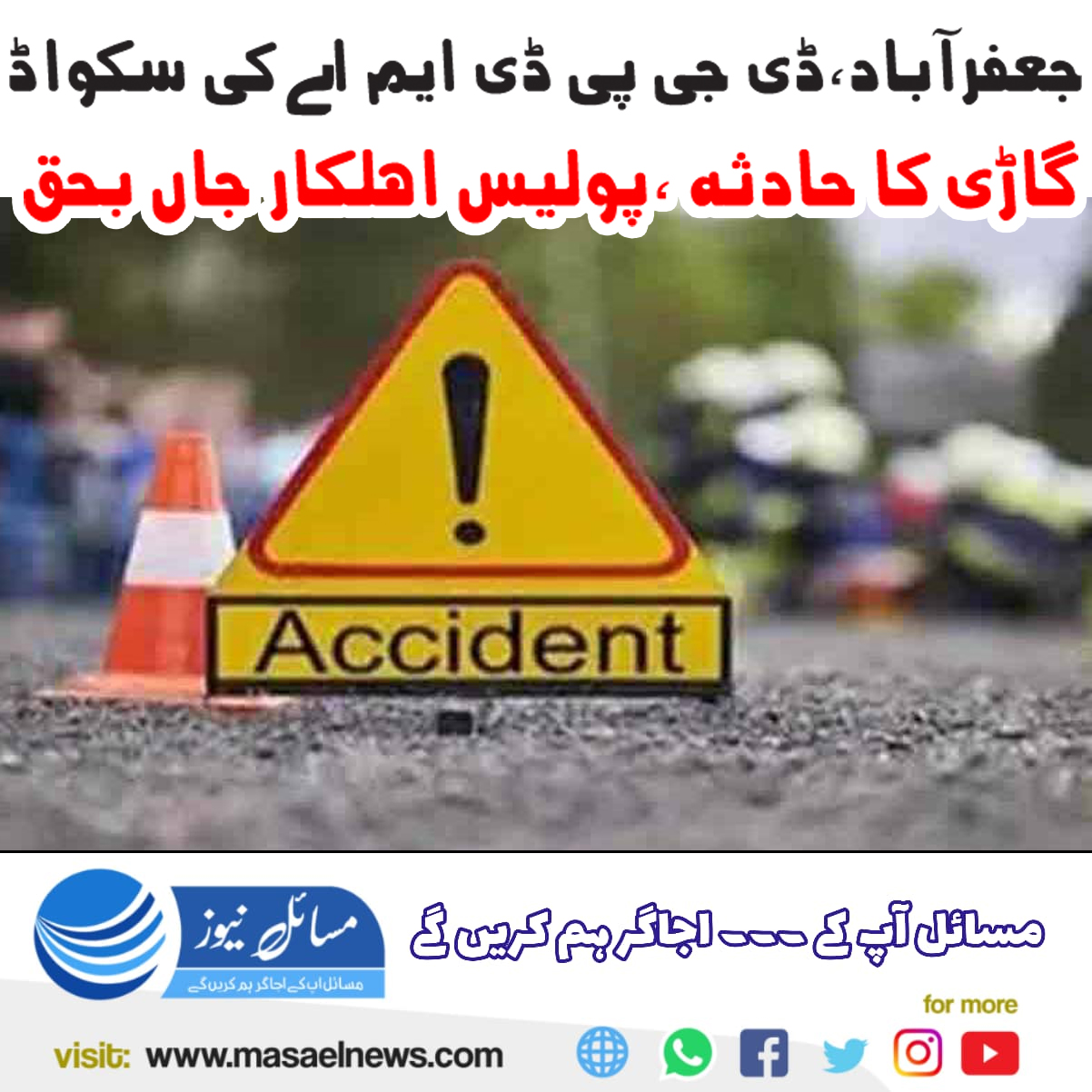 جعفر آباد(مسائل نیوز)جعفرآباد میں ڈی جی پی ڈی ایم اے بلوچستان جہانزیب خان کی اسکواڈ کی گاڑی حادثے کا شکار ہوگئی۔